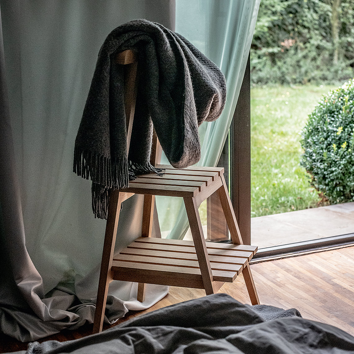 - Le design unique du majordome ressemble à une plate-forme à deux marches avec un dossier. Comme il est fabriqué en bois massif, il est particulièrement solide et robuste. Il vous accompagnera donc pendant de nombreuses années.