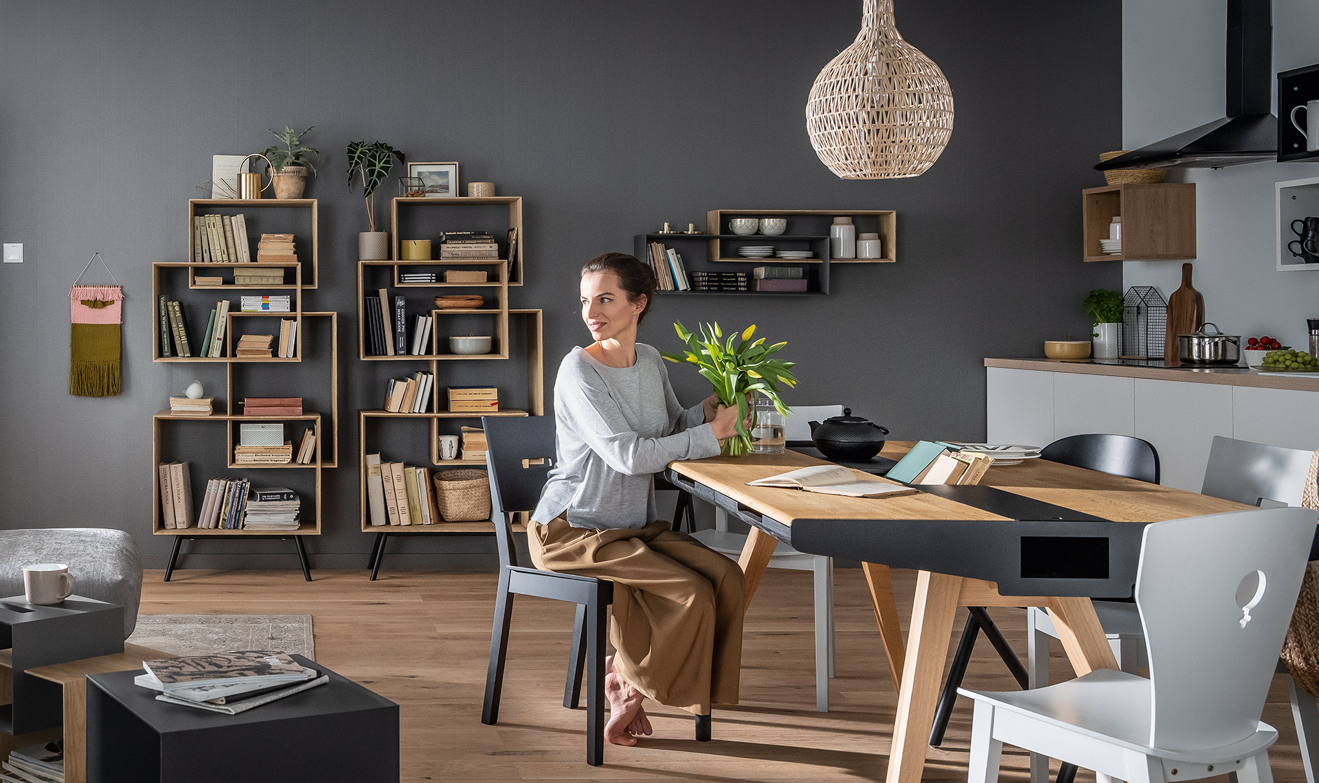 - Ici, le design moderne va de pair avec le caractère classique : les pièces maîtresses de la table Nature sont entièrement fabriquées en bois de chêne noble.