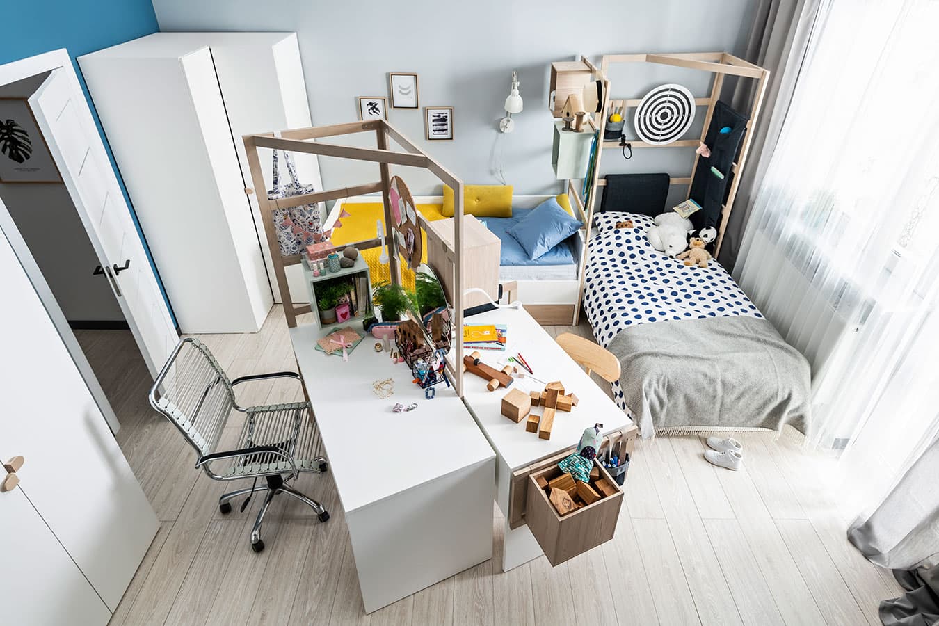 Combine the individual modules in any way you like: cabinets, shelves and platforms with capacious drawers - any combination will create an aesthetically pleasing whole. Adding open shelves will give the arrangement more lightness. Furniture in different colours allows you to create monochromatic compositions or more decisive colour mixes. As your child grows, you can completely change the arrangement.