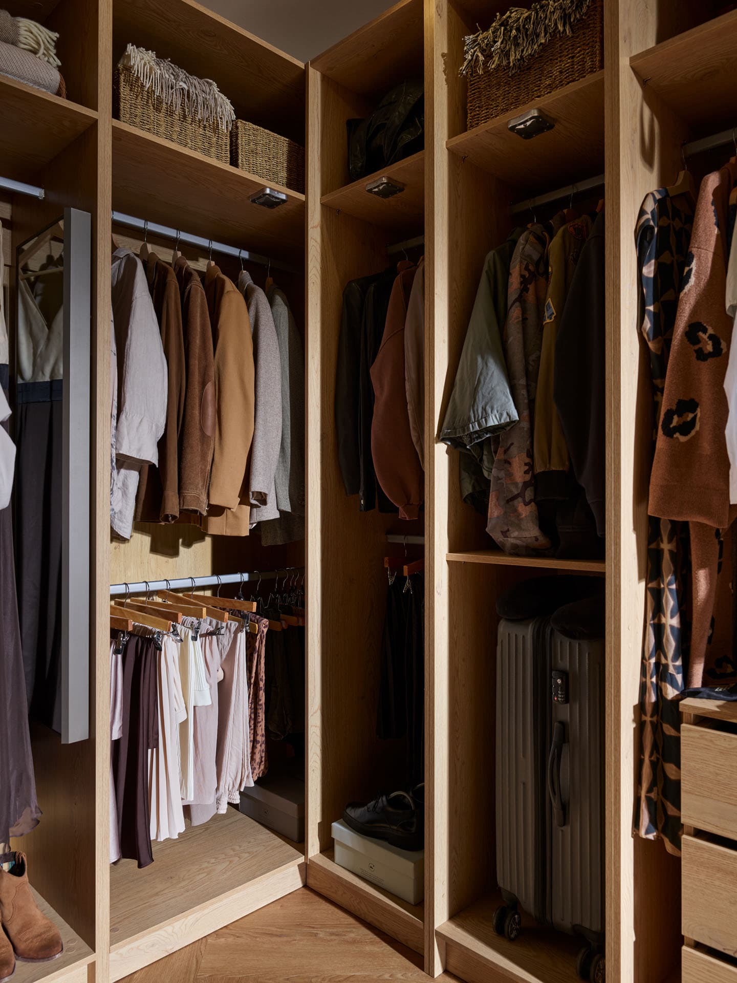 - The interior of the wardrobe is illuminated by LED lights with motion sensors, which light up automatically. This practical solution makes it easy to reach for clothes without turning on the lights in the room. LED lighting is available in configurations with rods - it is not used when choosing shelves alone.