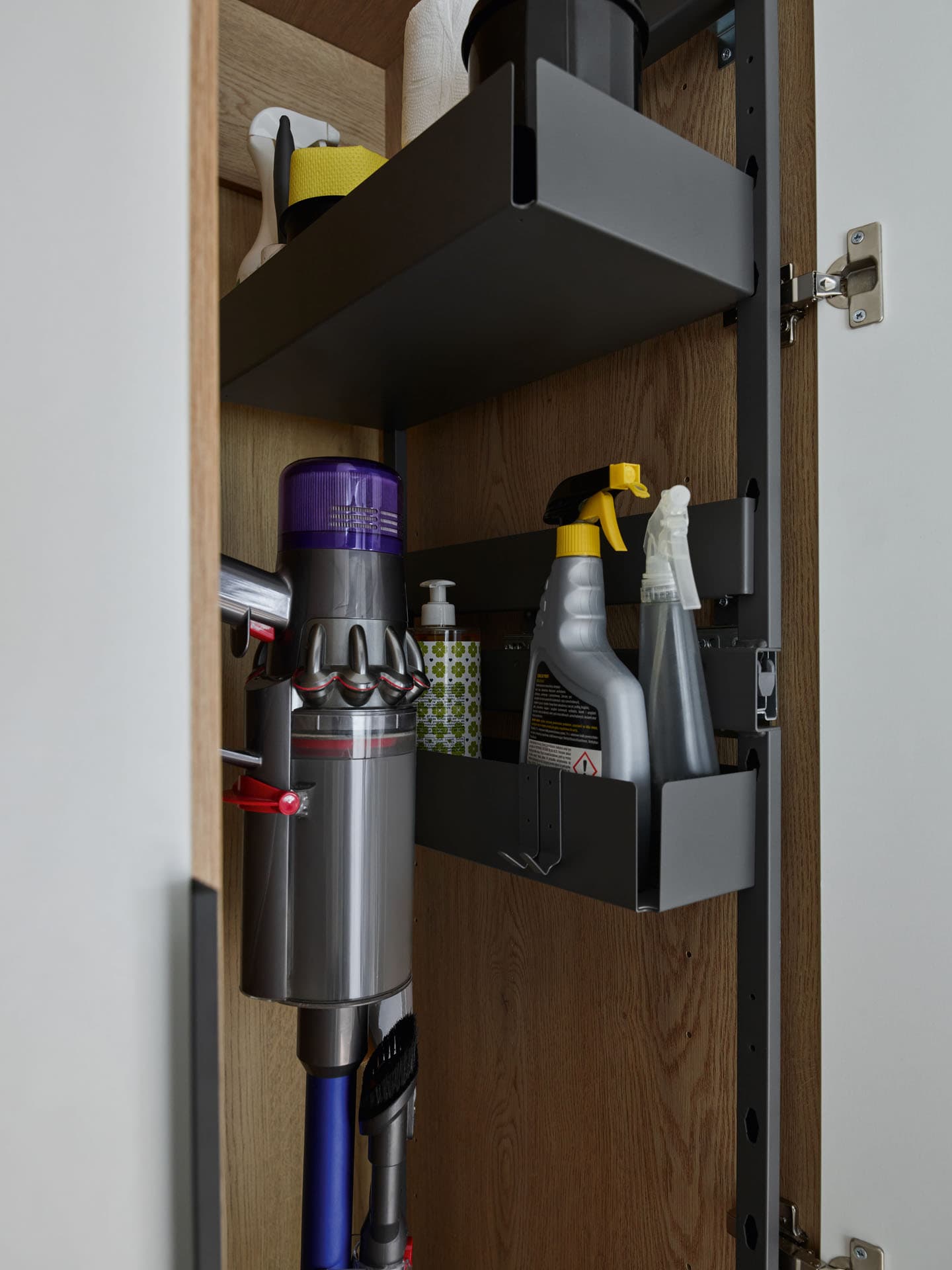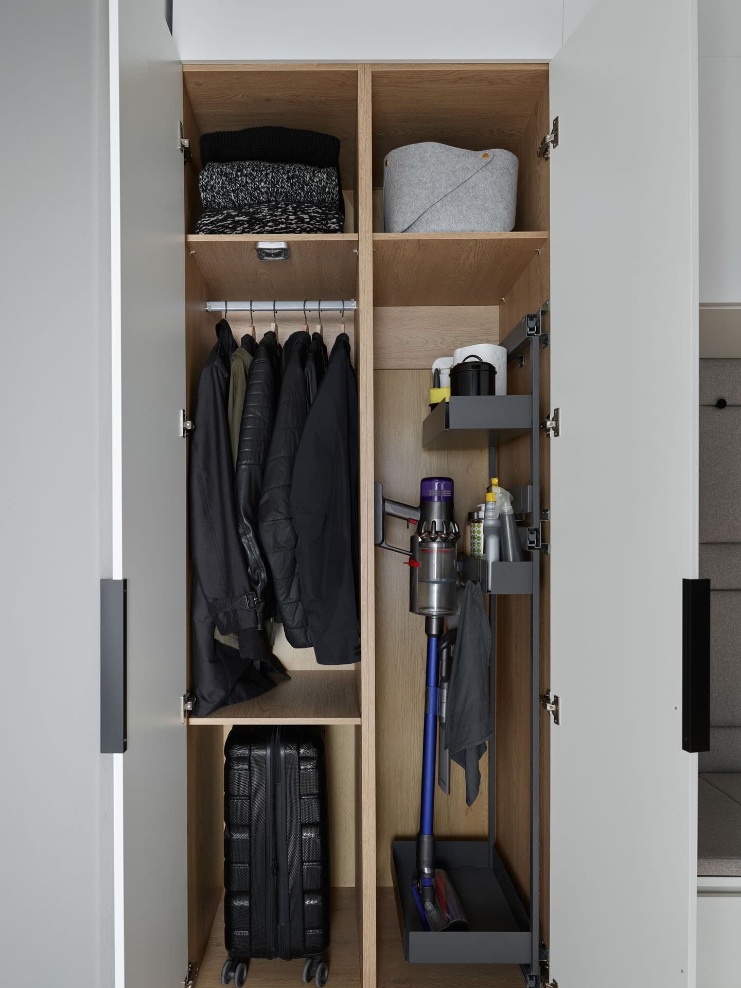 A utility closet with a pull-out cargo basket is a practical solution for organizing tall and hard-to-store items in a closet. It facilitates storage by providing quick and full access to the entire contents of the wardrobe. The wardrobe with a cargo basket will prove useful as a stand-alone unit or as part of a larger custom-made wardrobe. The pull-out cargo mechanism allows you to comfortably reach for stored items, and the well-thought-out arrangement of baskets makes it easier to maintain daily order and good organization of the interior.