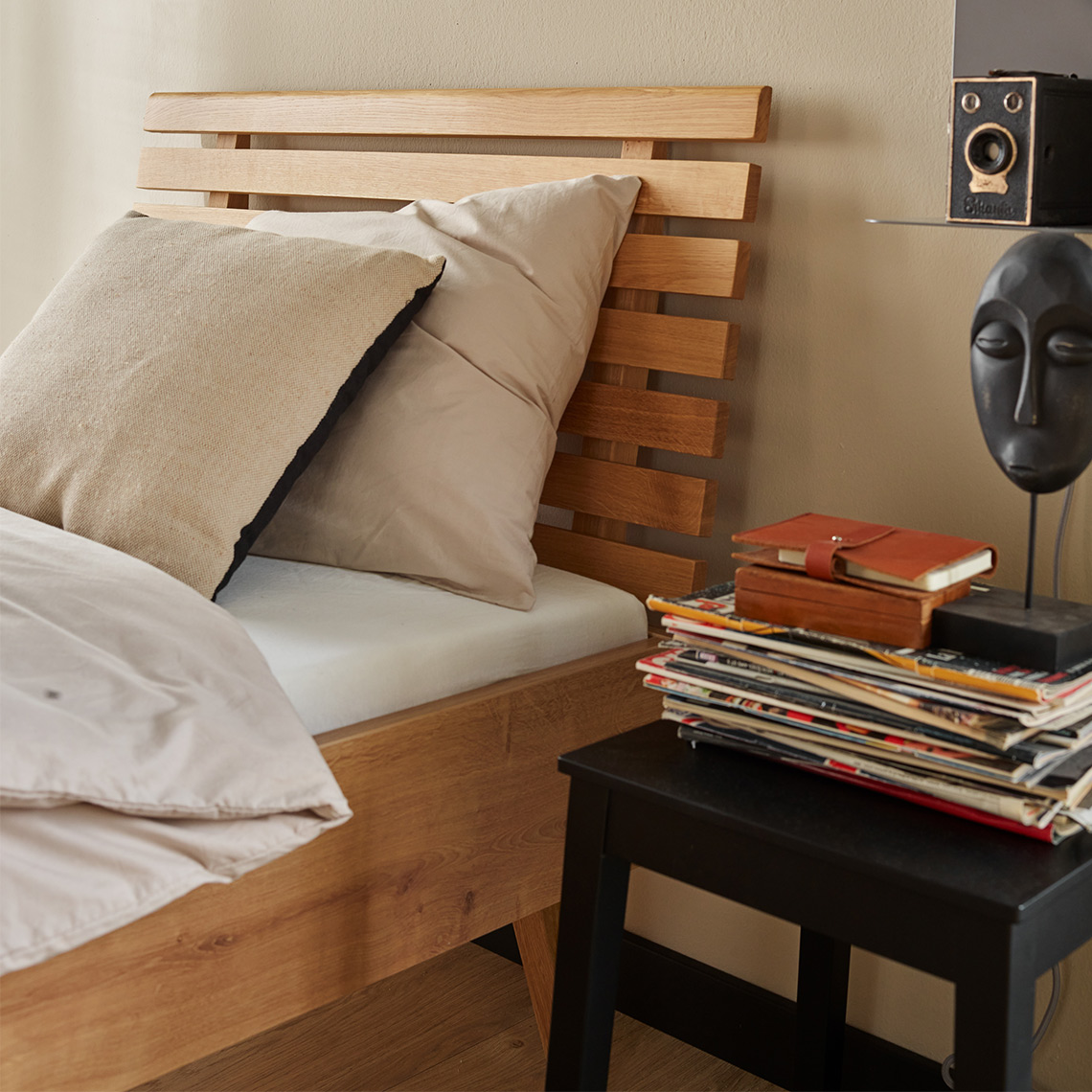 - Solid oak wood, protected by matte varnish, was also used to construct the openwork headrest. The material is also present in the lower, rounded edge of the bed.