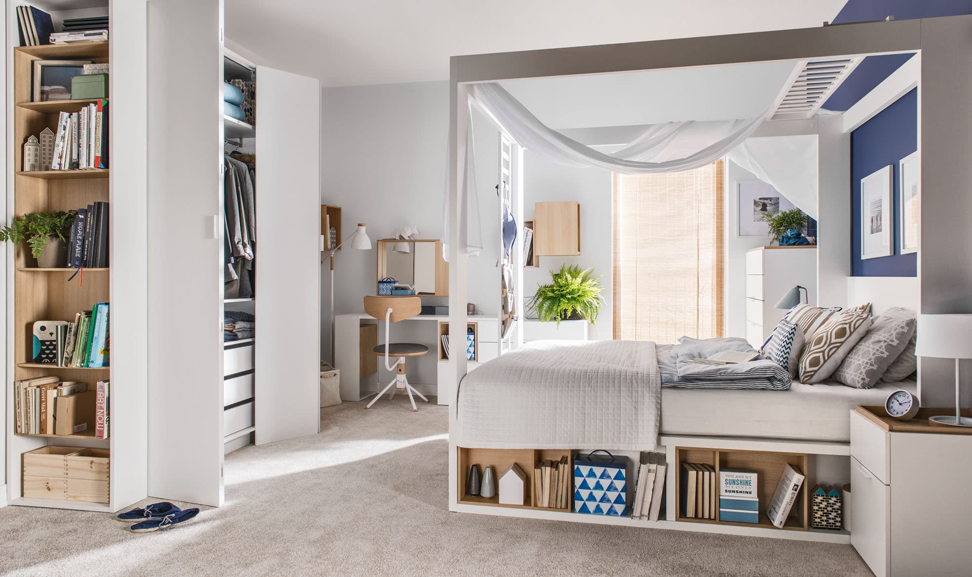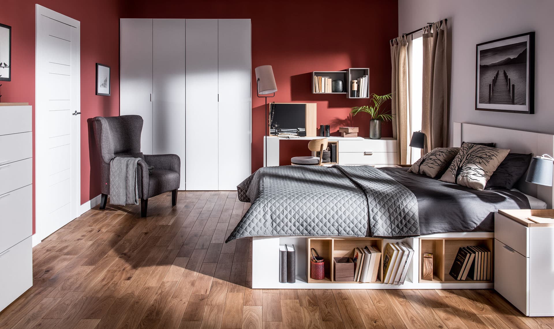 - To gain more storage space you can use a side bookcase, which is attached to the closet. You can put books, decorations or pots with plants on it. The oak recess of the furniture will bring a touch of nature into the interior, giving it a cozy feel.