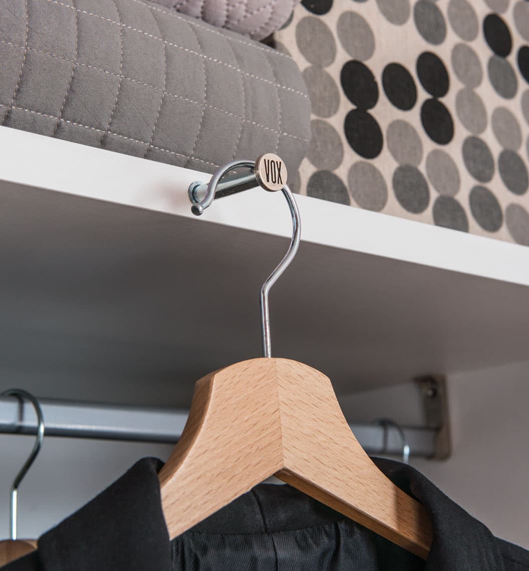 - On the upper shelves you can store seasonal clothes and shoes. It will also accommodate boxes of items you rarely reach for. You will also find metal hooks by them, which will improve your morning getting ready to go out. You can place hangers with ironed clothes on them, prepared for the next day.