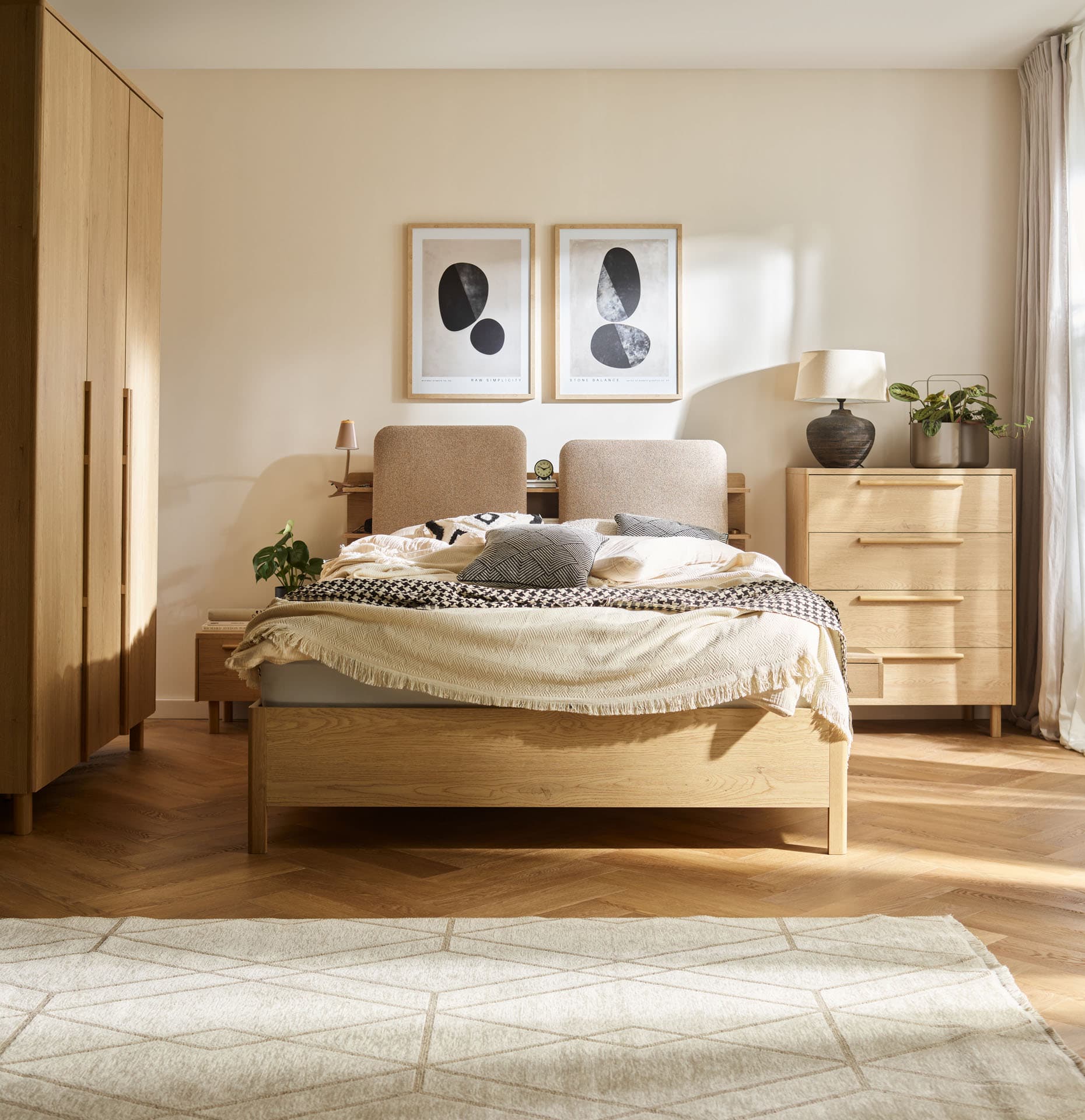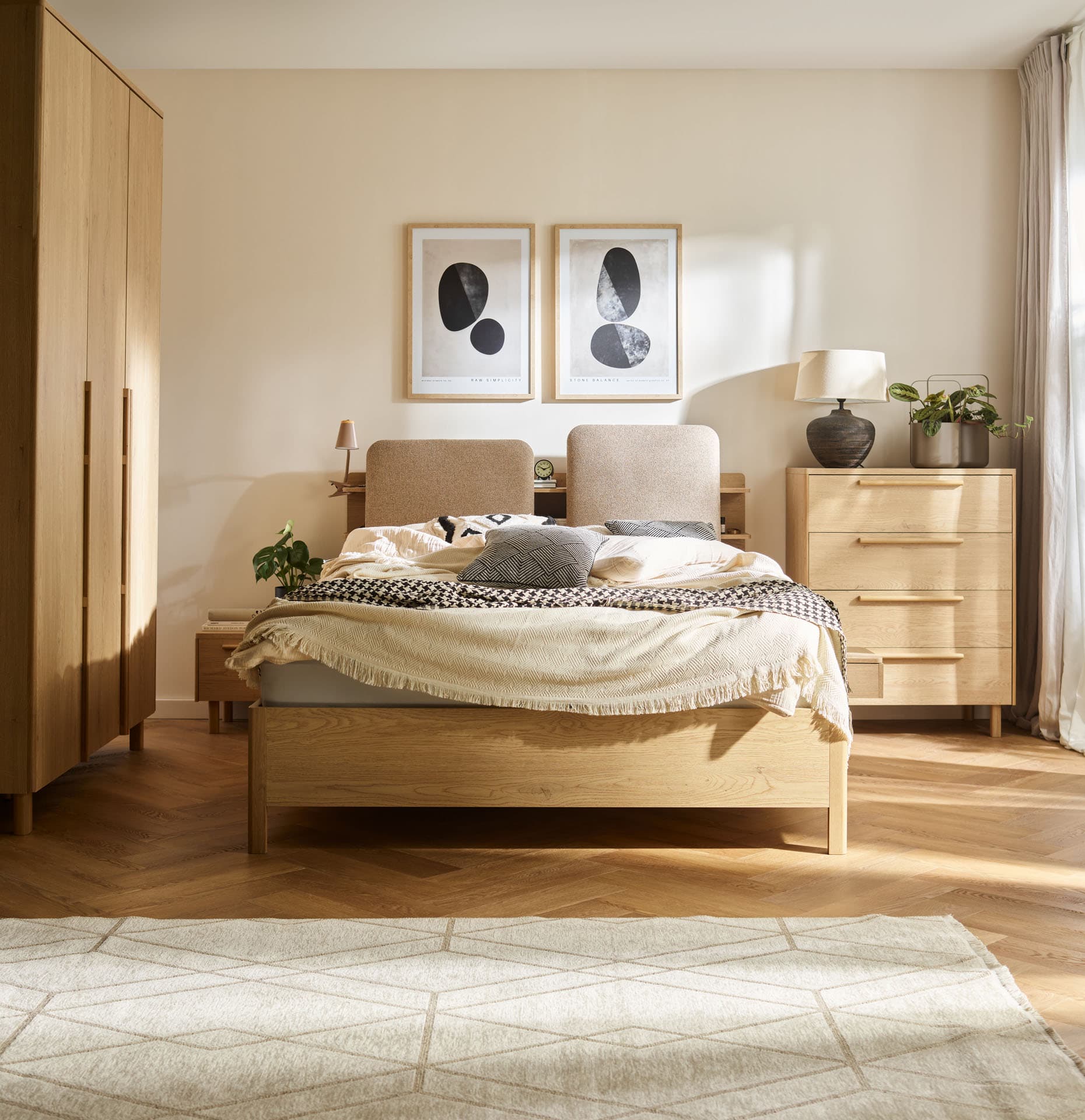 - Soft, upholstered backrest cushions increase comfort when reading or relaxing in a sitting position, and their neutral color scheme blends harmoniously with the warm shade of wood.