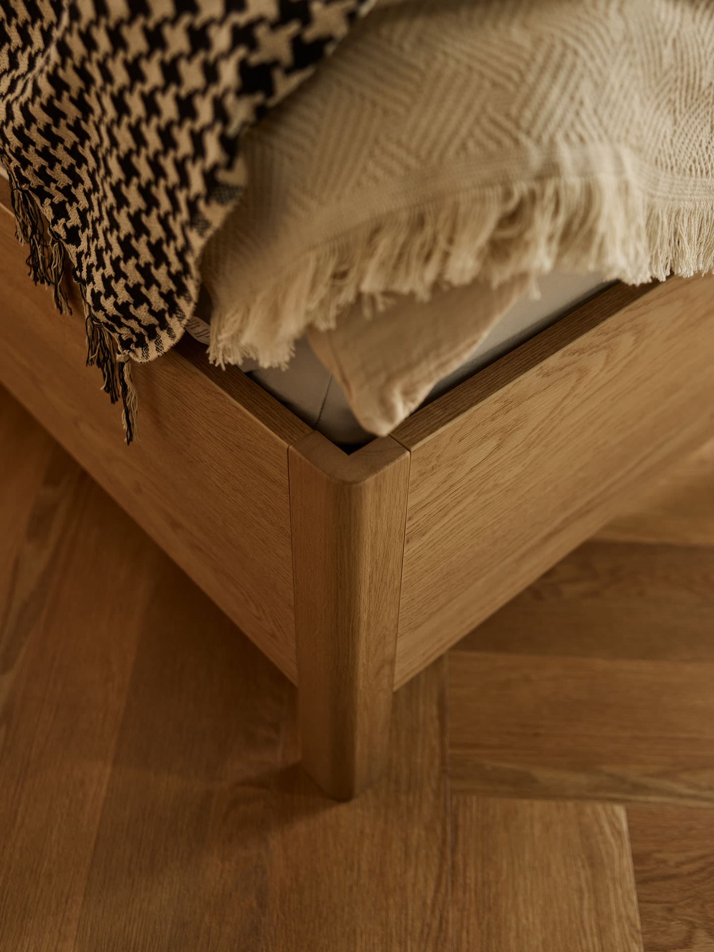 - The body of the bed is set on oak legs, which raise the body above the floor, giving it lightness and making it easier to keep the bedroom tidy.