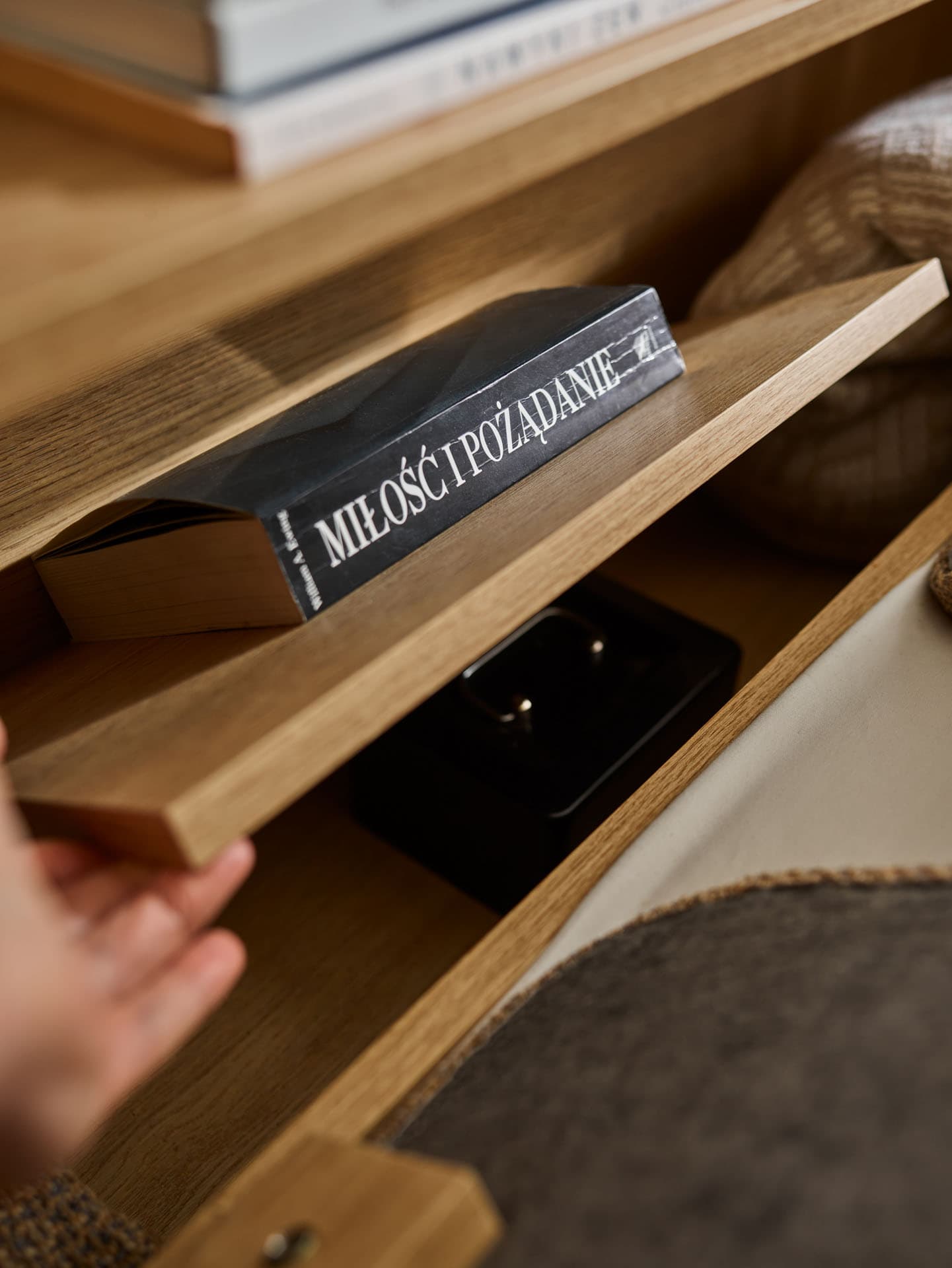 The Well bookcase bed was designed as the centerpiece of a calm, well-organized bedroom. Combining a place to sleep with a thoughtful storage area around the headboard allows you to have the most necessary things always at hand and builds daily comfort without the need to reach for additional furniture. The model of this bed is available in several sizes, so you can easily fit it into your bedroom.