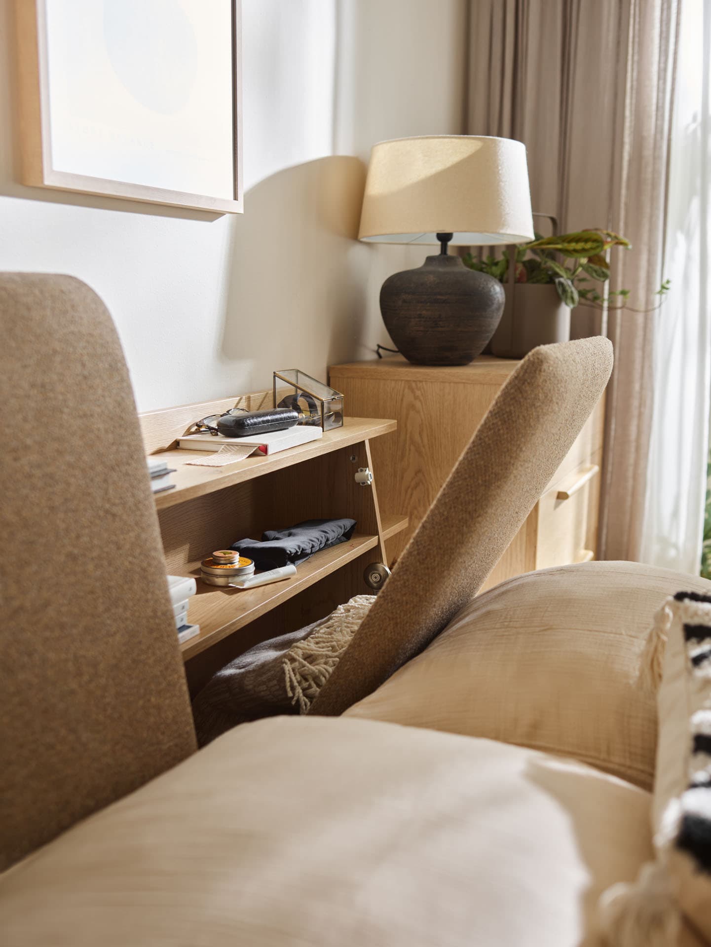 - Soft, upholstered backrest cushions increase comfort when reading or relaxing in a sitting position, and their neutral color scheme blends harmoniously with the warm shade of wood.