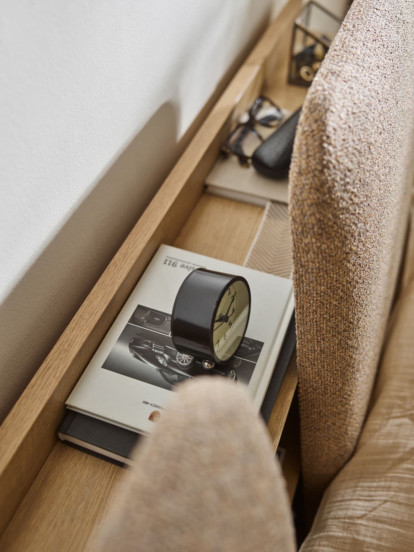 - Behind the two upholstered backrests, mounted independently vertically or horizontally, there is a container with a shelf, ideal for books, small accessories or items used just before bedtime.