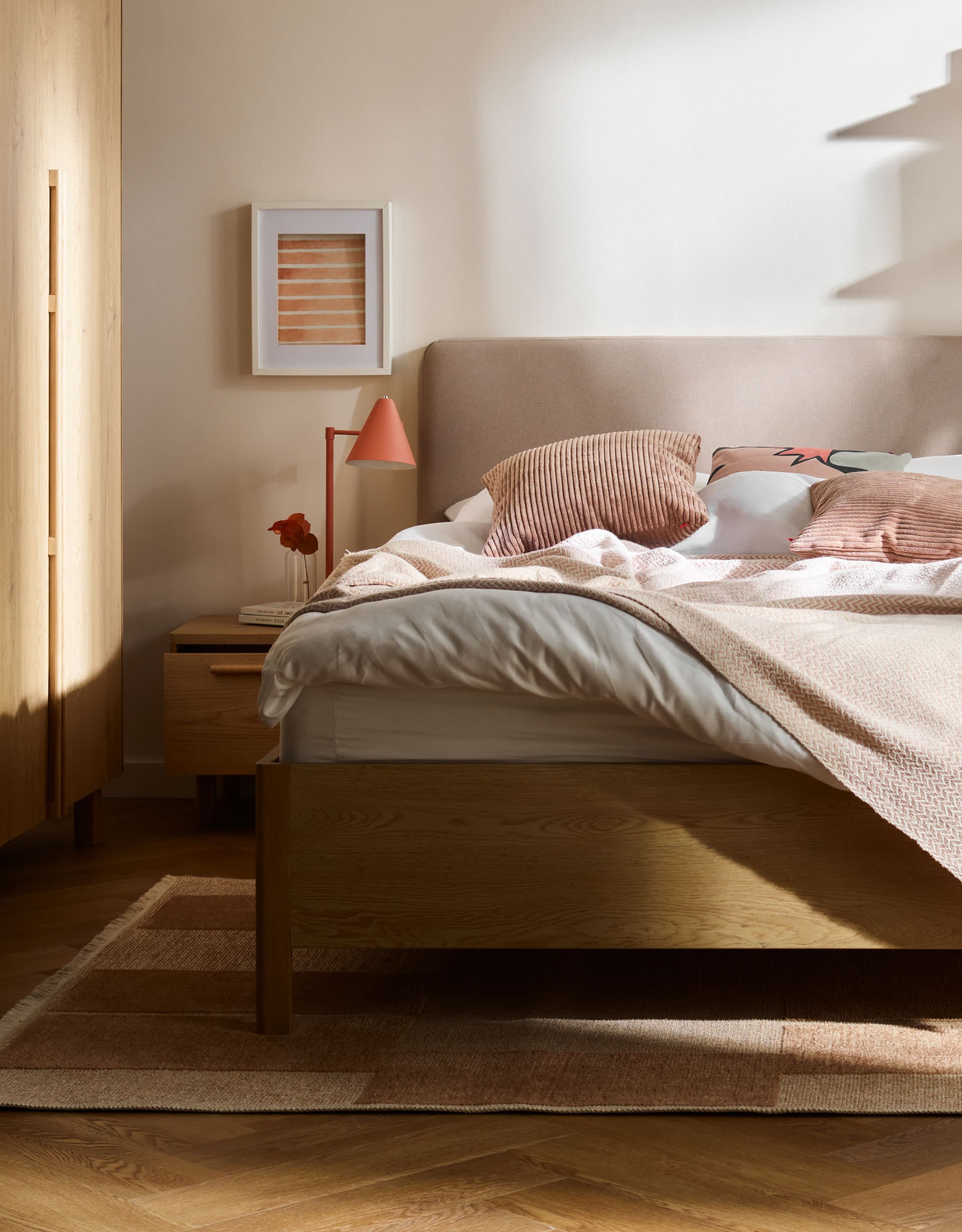 - The soft, upholstered form of the headrest brings a sense of coziness to the interior and balances the simple, calm line of the wooden bed frame.