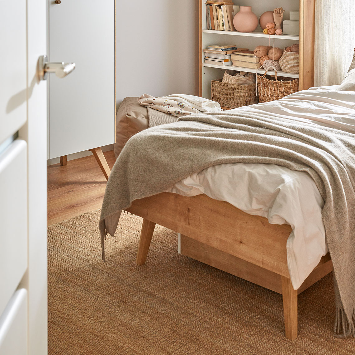 - The bed frame has an oak color thanks to the veneer with wooden decor.
