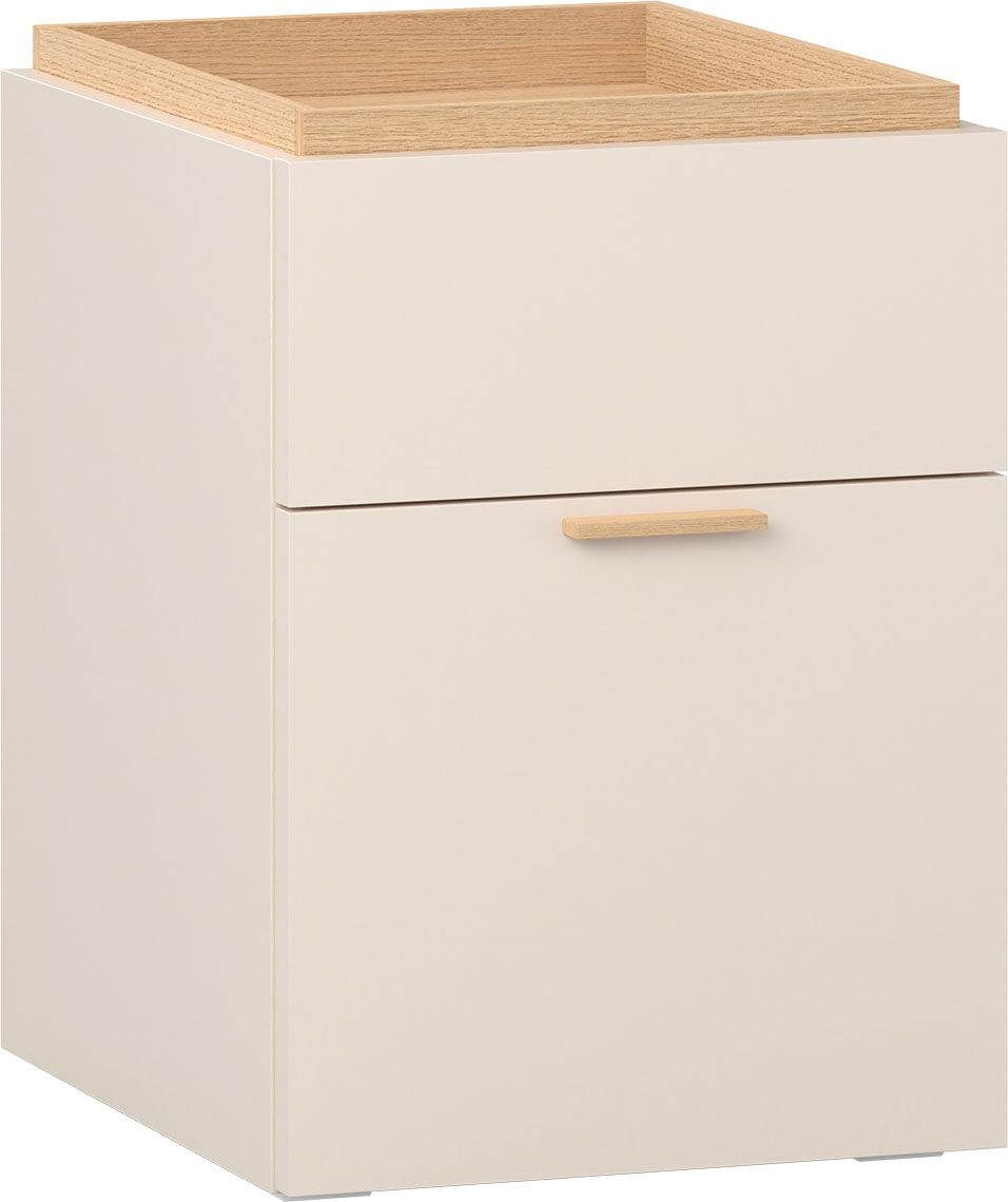 - Sturdy slides with a quiet close make the drawers slide out easily and smoothly. This is also facilitated by the ergonomic handle with which the larger one is equipped. It can be wooden or metal in the color of the furniture.