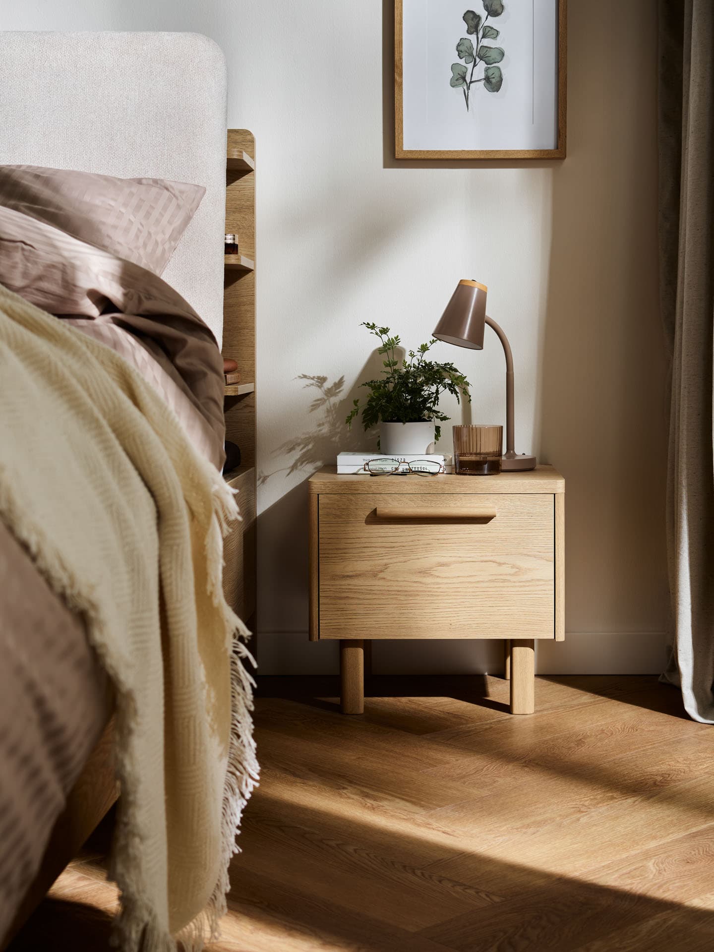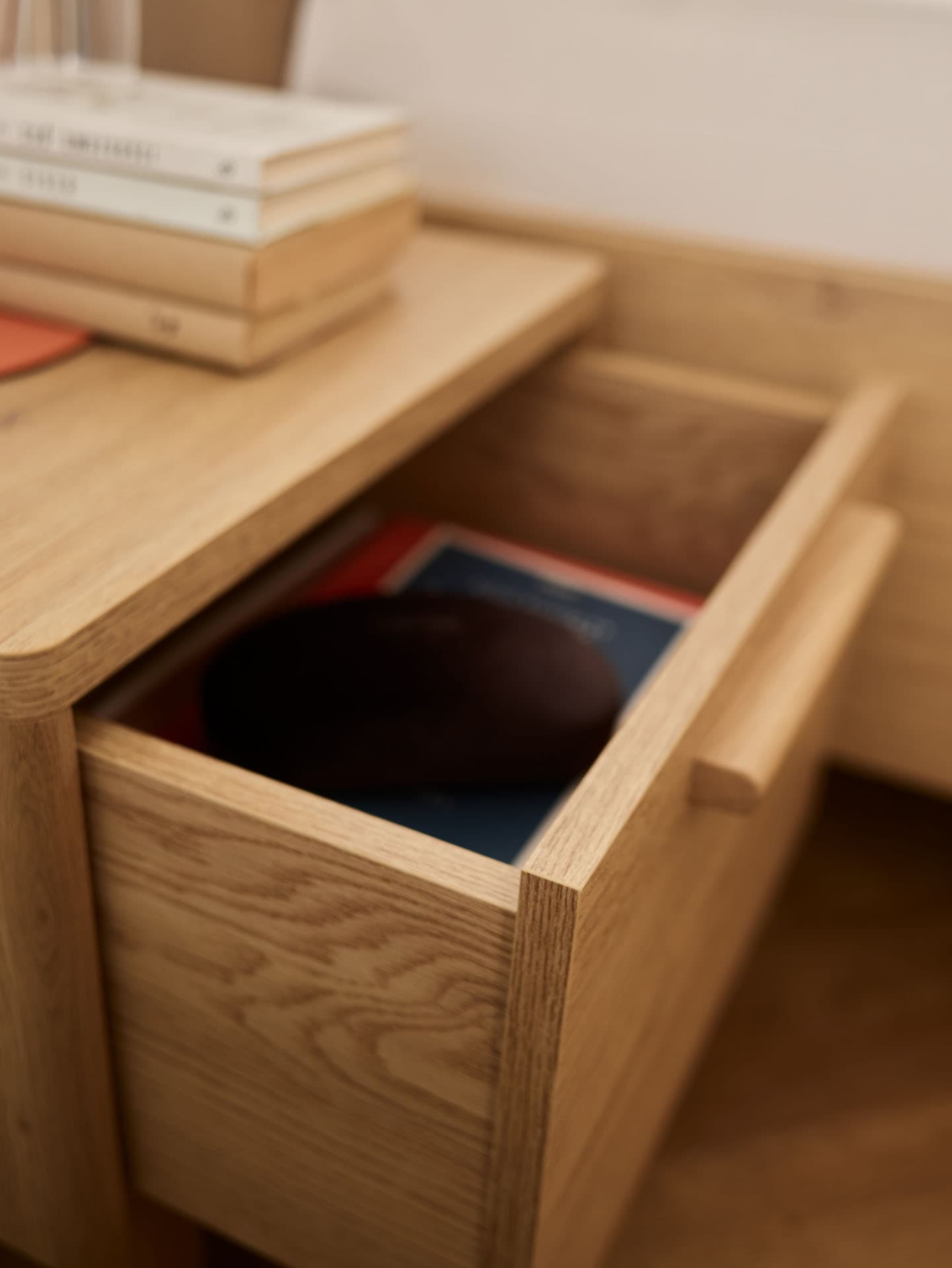 The Well bedside table was designed as a natural complement to the sleep area - a place for things that accompany evening quiet and unhurried mornings. With its compact body, natural wood color and softly finished edges, the piece of furniture discreetly organizes the space by the bed and blends in with its surroundings.