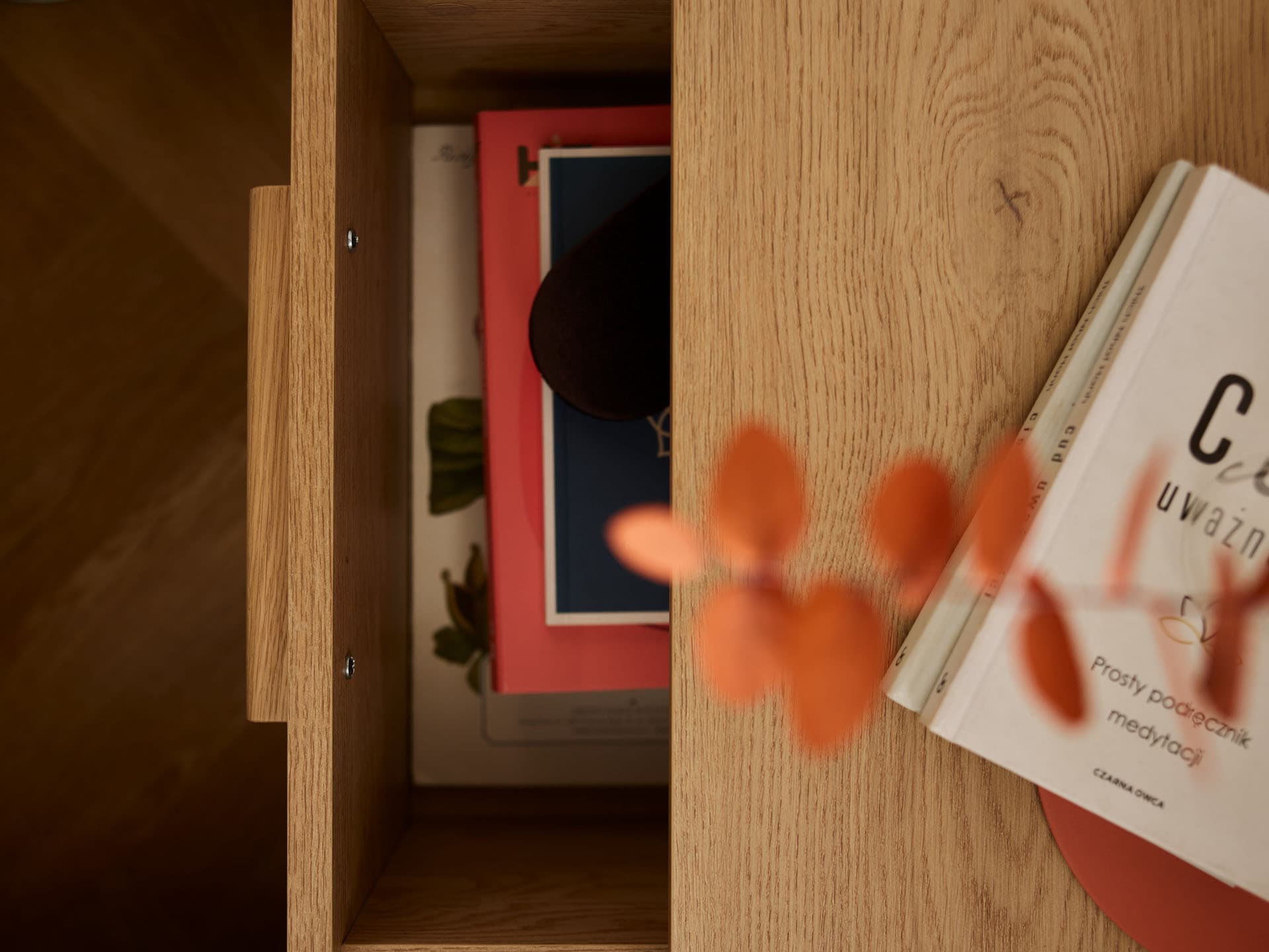 - The drawer works on reliable slides with a silent closing mechanism, so using it does not disturb the peace of your evening rest. The long handle made of solid oak is durable, pleasant to the touch and facilitates comfortable opening of the furniture.