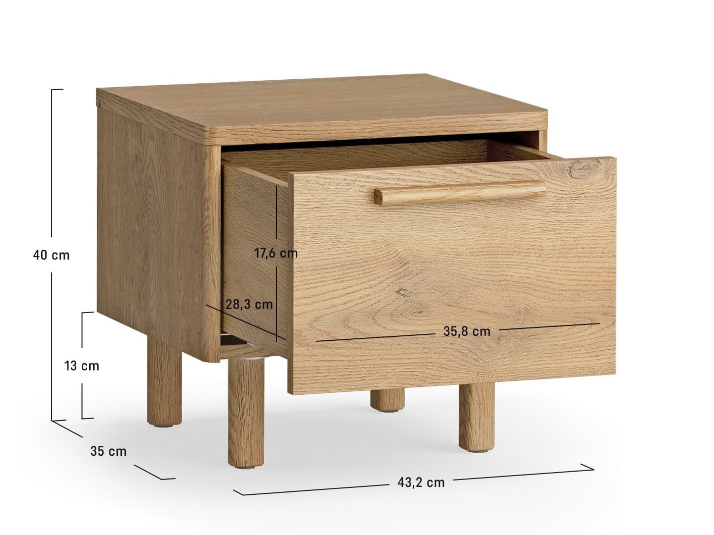 - The table stands stably on oak legs with a height of 13 cm, which add lightness and make it easier to keep the bedroom tidy.