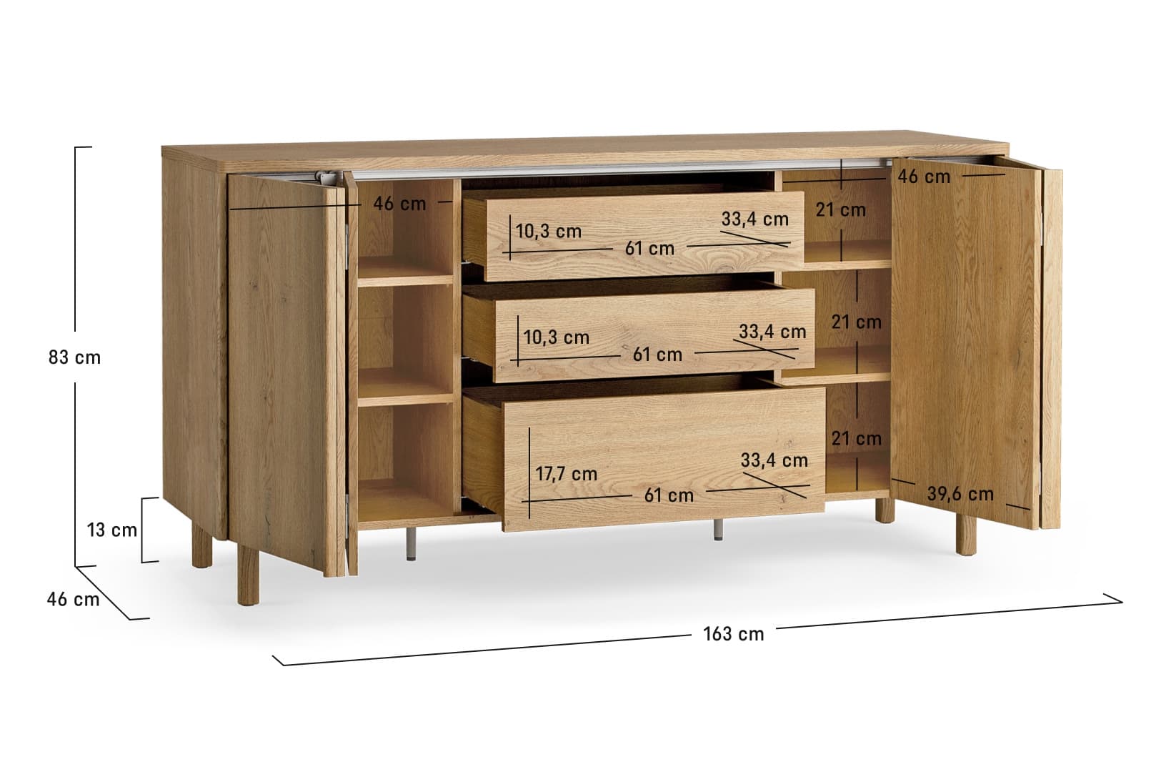 - The whole is supported on oak legs with a height of 13 cm, which give lightness to the solid and allow easy cleaning under the furniture.