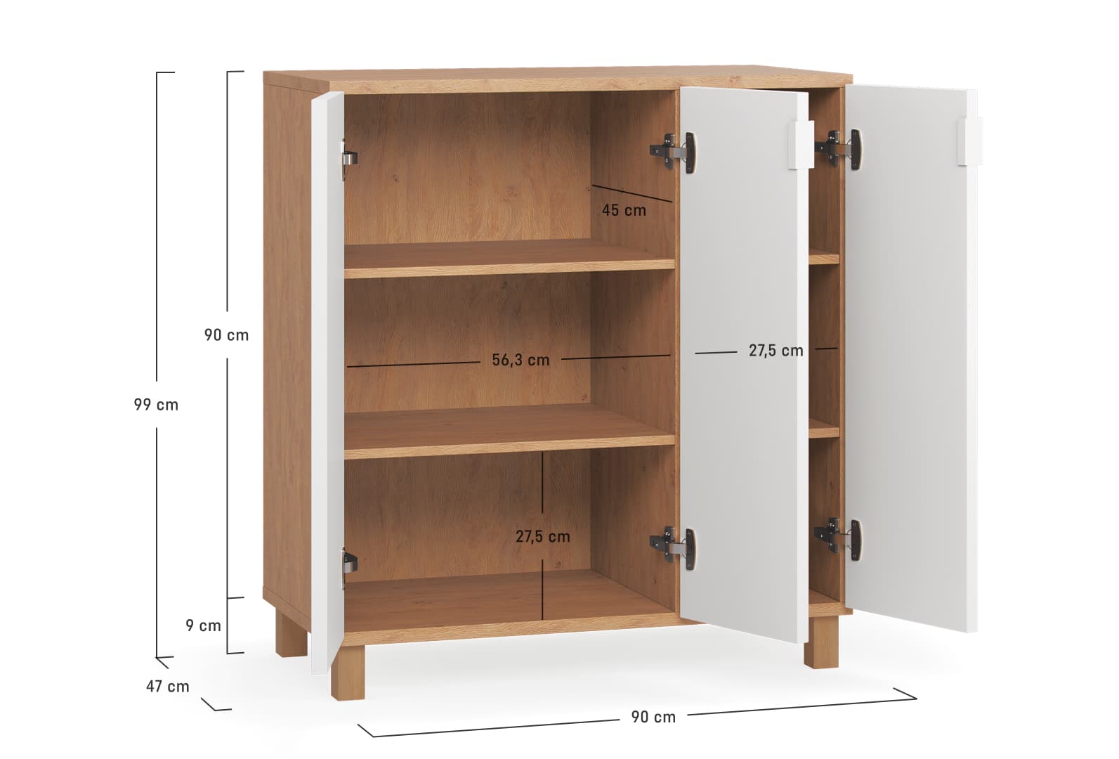 - Inside the chest of drawers there are two spaces. On the left side is wider, on the right narrower. In each of them there are two shelves with adjustable height. This allows you to adjust the interior of the chest of drawers to the dimensions of the items you want to keep in it.