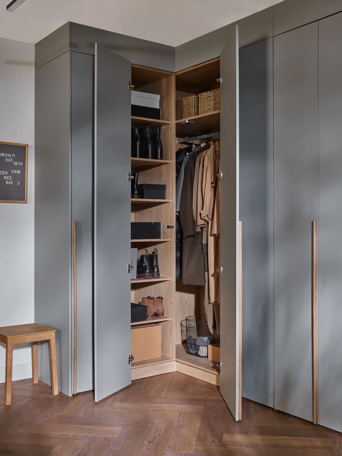 Created for practical use of corners that are difficult to arrange. Thanks to clever masking panels, it allows you to achieve the effect of custom built-in without the need for a carpenter. It comes in three equipment packages, and its appearance can be easily personalized by choosing colors and handles. It is a universal solution for many spaces - from the hallway and closet to the bedroom and children's room.