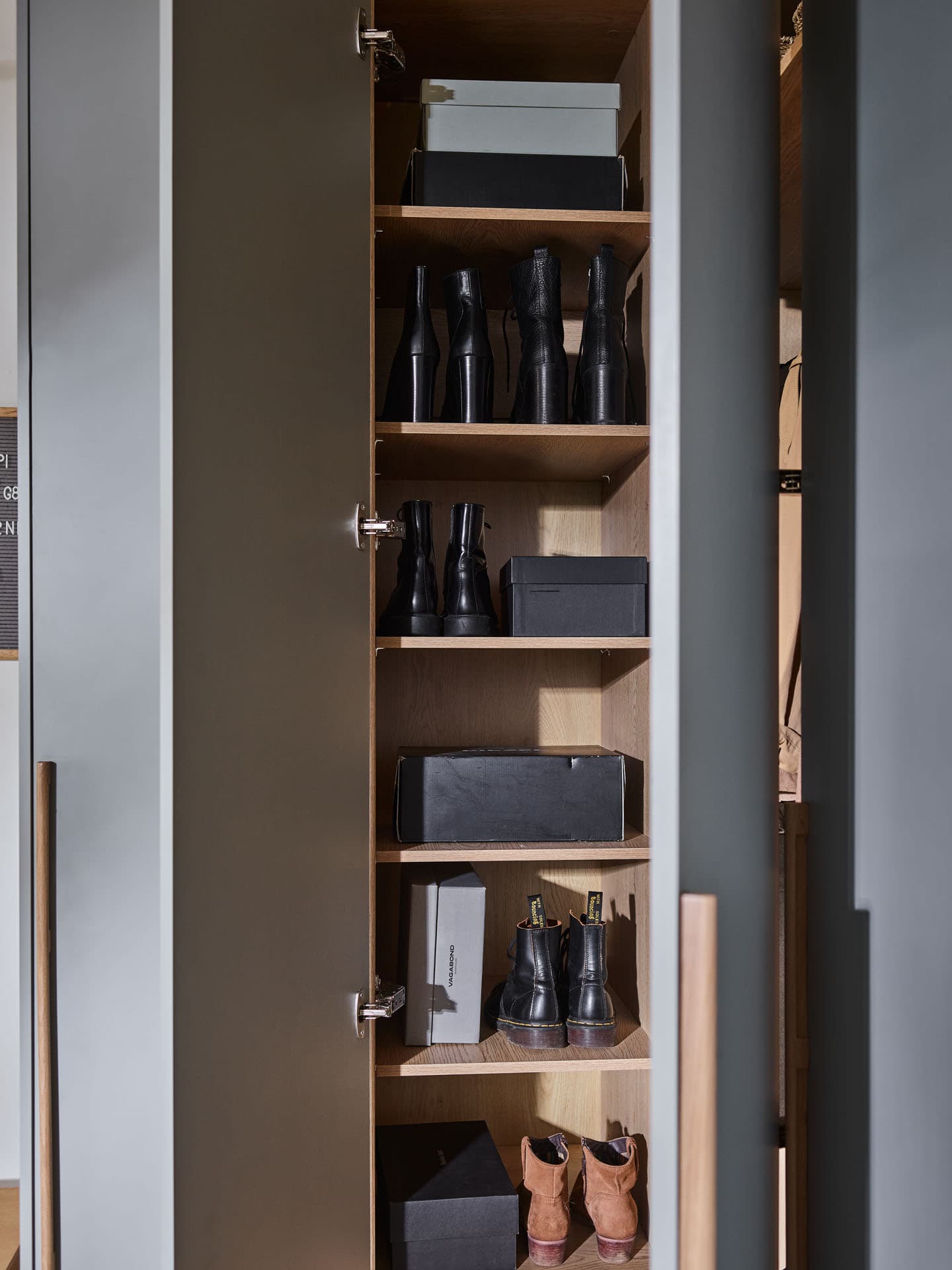 - Thanks to its open design, it gains lightness, and its interior remains conveniently accessible on a daily basis. If necessary, it can be supplemented with a corner wardrobe door - the first one opens classically with a handle. After opening them, it is possible to access the second door that opens with a push-to-open system.