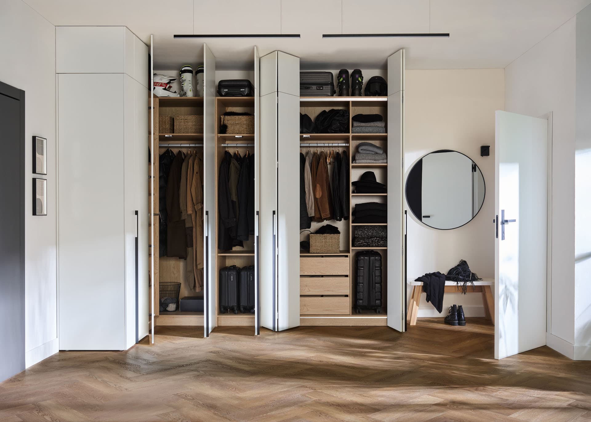 Stor wardrobe fronts were created from durable 16 mm thick furniture board.