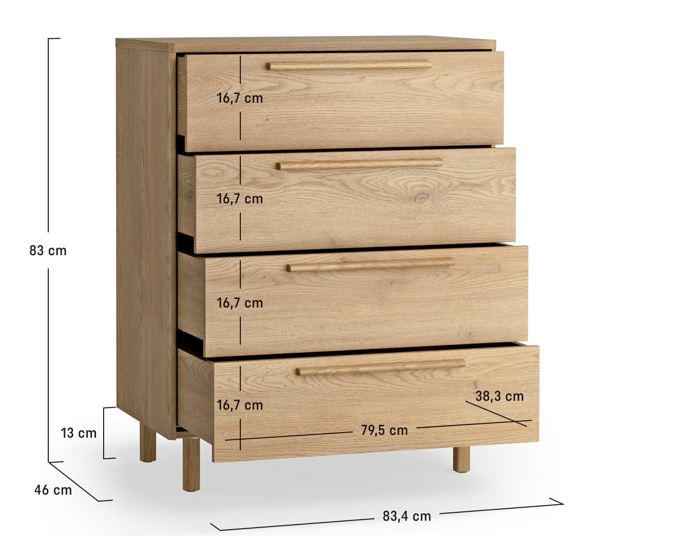 - The chest of drawers is set on wooden, oak legs with a height of 13 cm, which makes it easier to keep clean under the furniture and gives the solid a lightness.