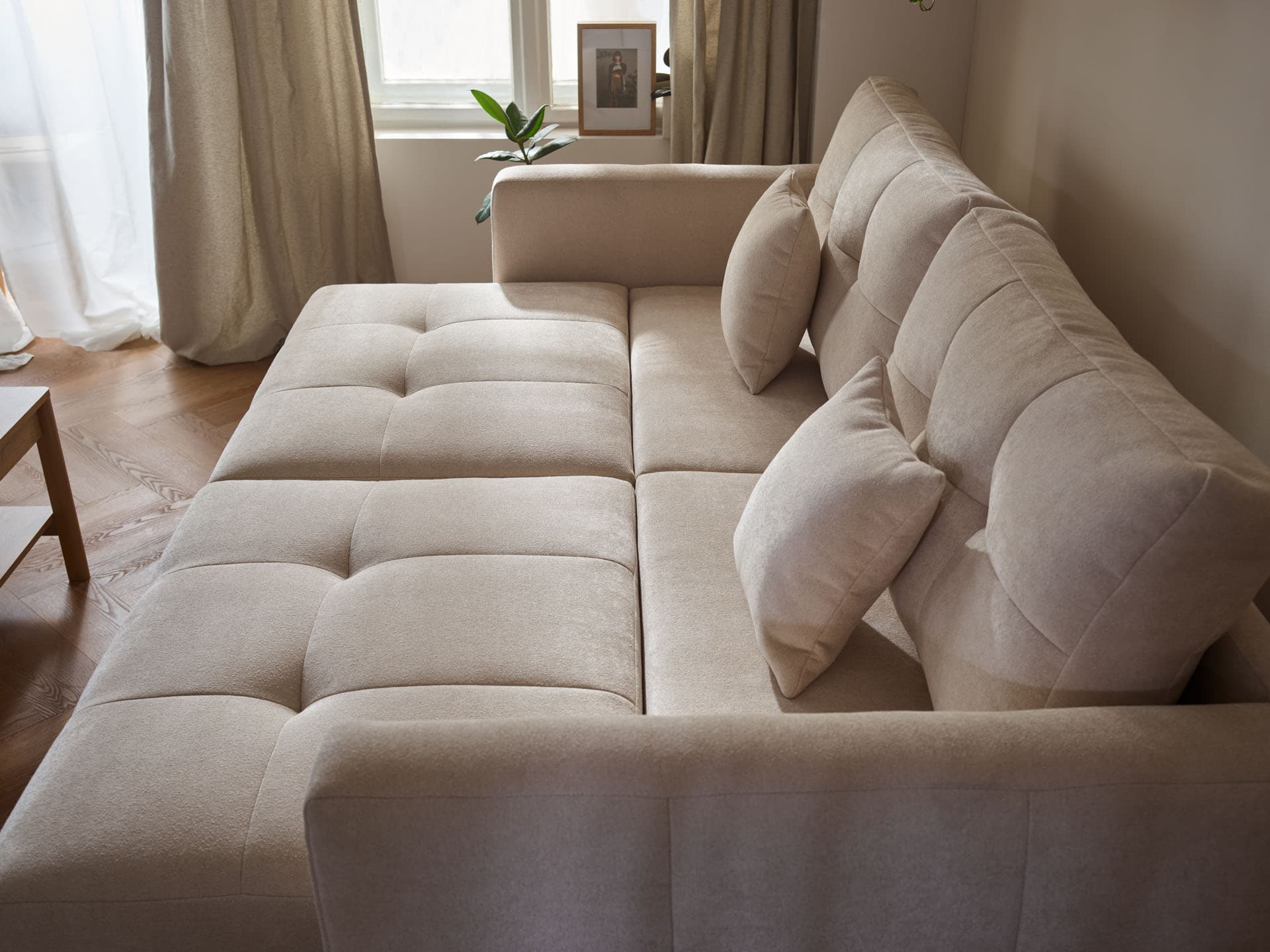 - The unique function of independent modules allows you to pull them out at the same time and create a place to relax in a semi-reclining position for all users of the sofa.
