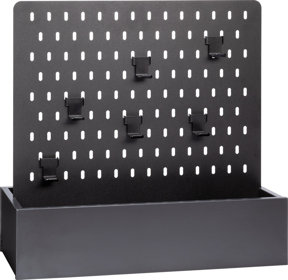 - The perforated board and hooks were manufactured from powder-coated steel sheet with a fine matte texture.