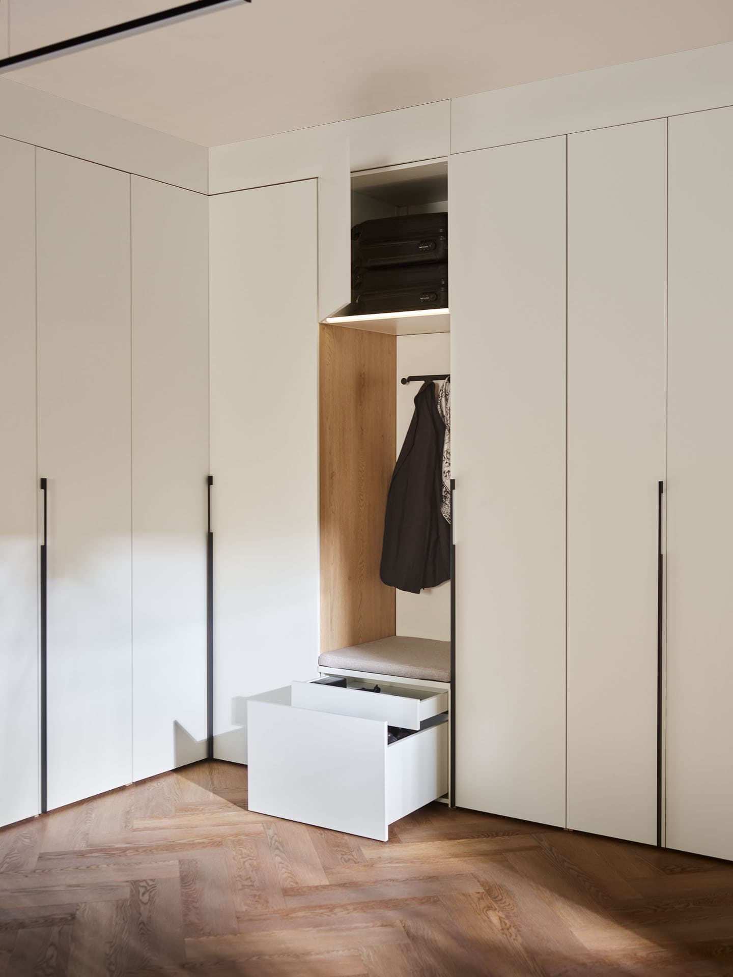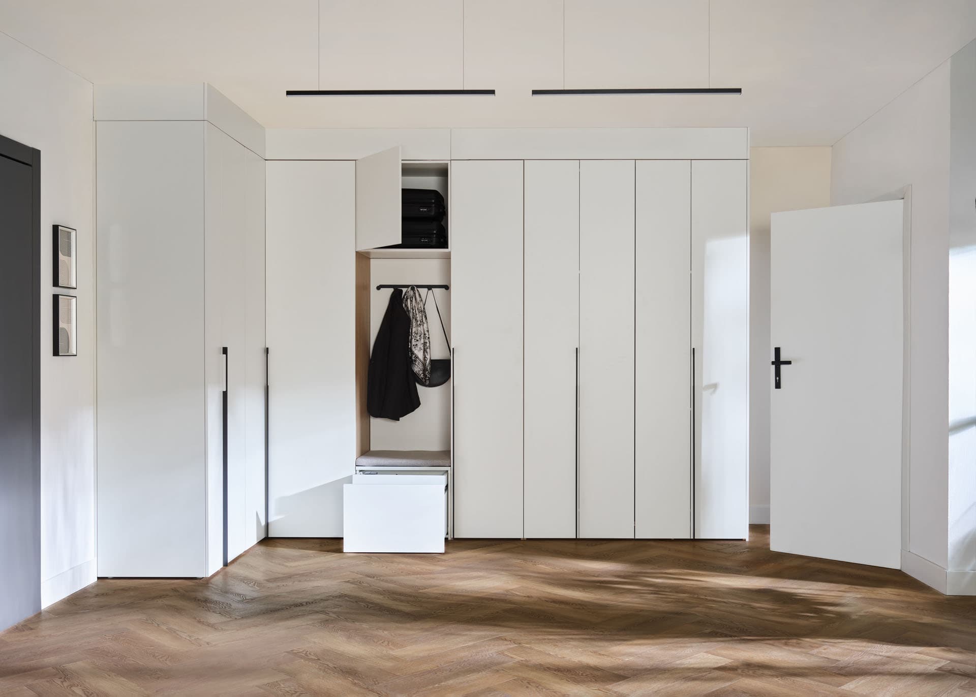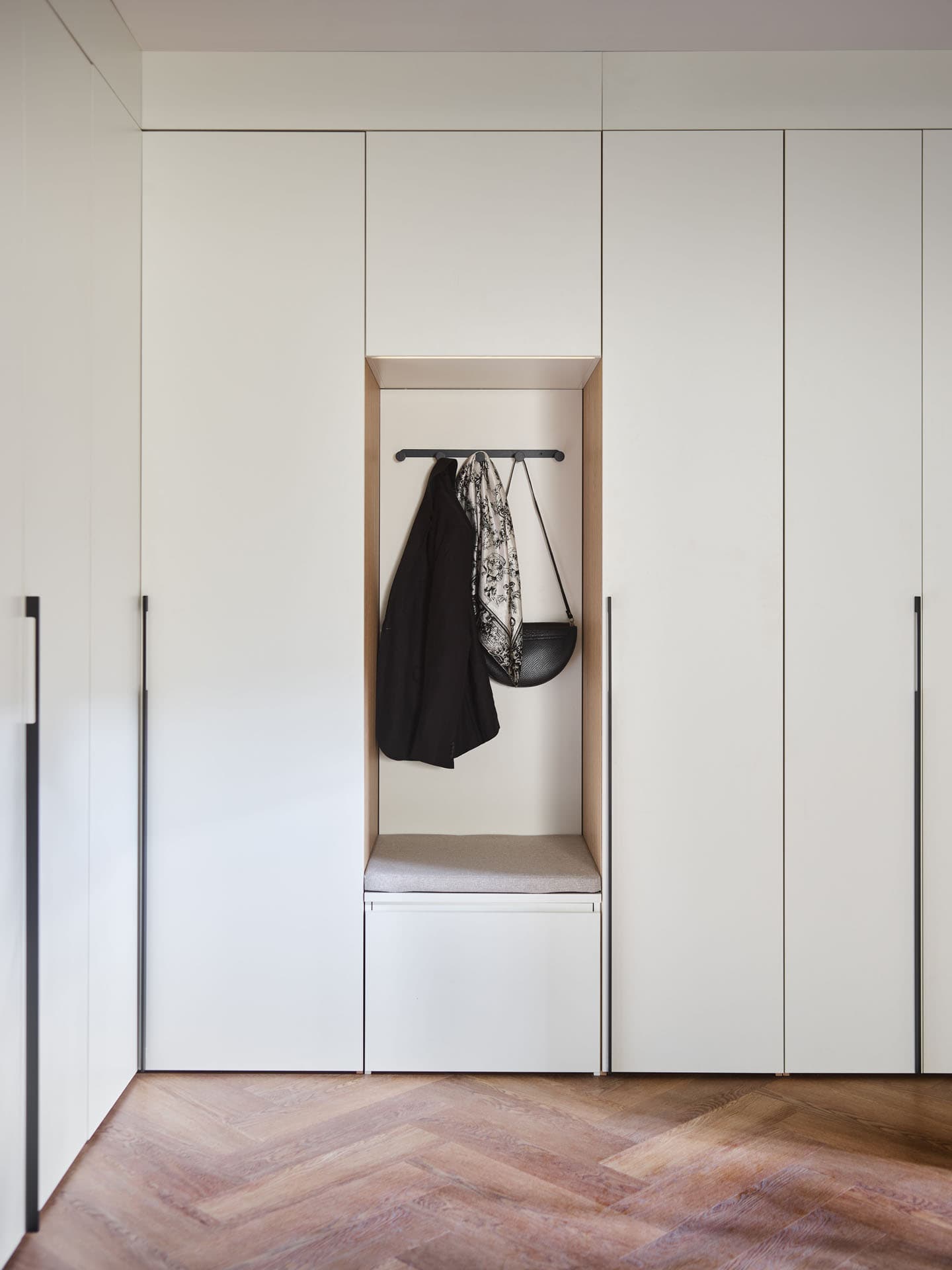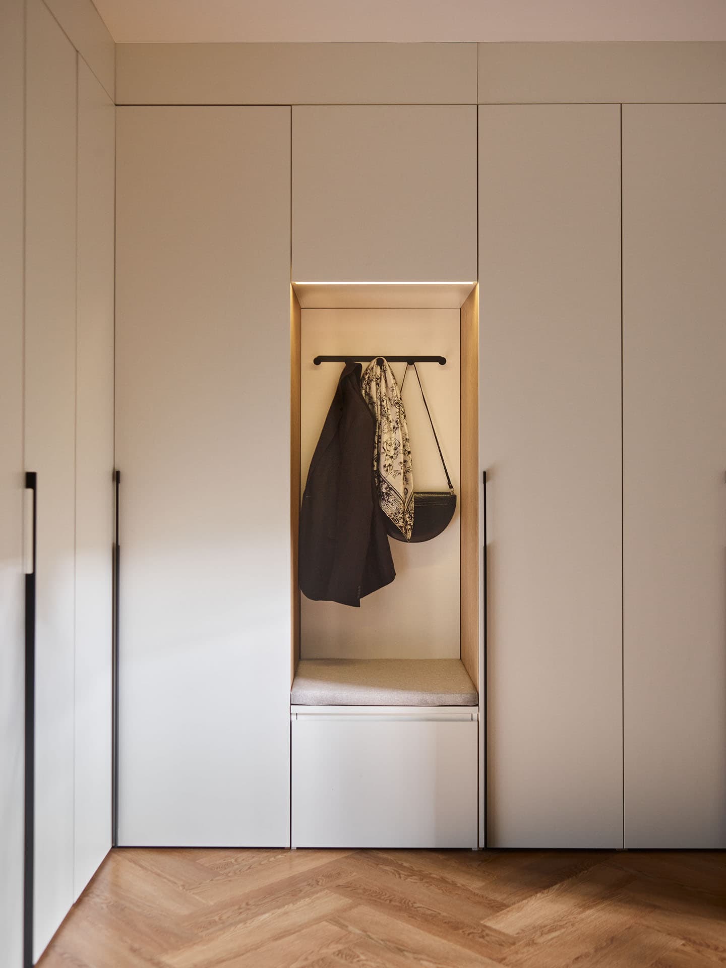 - Comfort Package - The equipment includes a soft-seat cabinet with a bottom drawer for shoes and an inner drawer for small accessories, such as umbrellas, keys and small accessories. Also included is a back panel of the board with a lath with hooks, and a top pavilion with LED lighting on the front. In addition, the rear surface of the built-in has been finished with upholstered panels, which increase the comfort of use and give the whole unit a cozier feel.