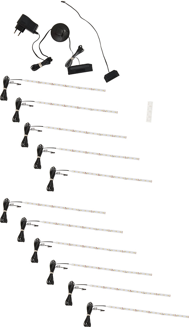 Easy-to-install LED lighting system matched to the open shelves of the bunk bed. A total of 11 LED strips connected together, switched on by a convenient foot switch. Combining a practical solution with a decorative accent, the lighting gives a pleasant, warm light.