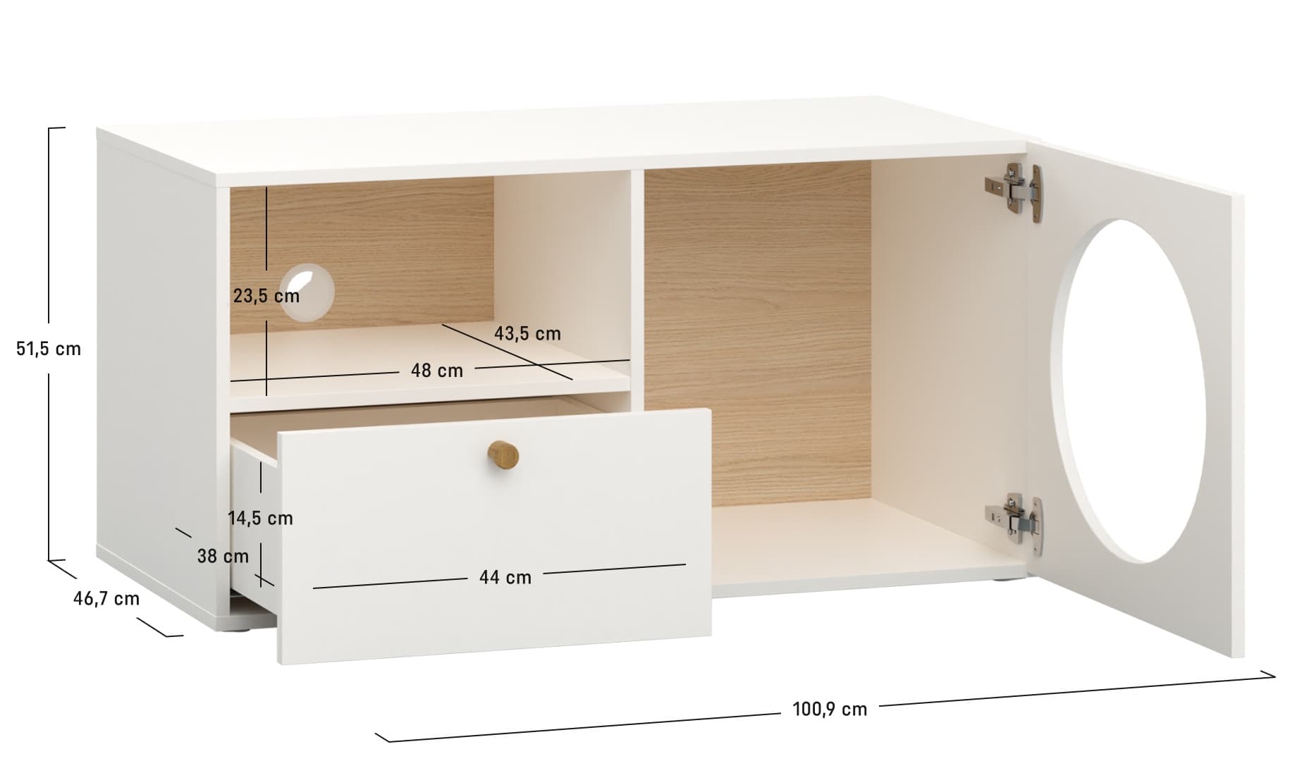 - The RTV cabinet consists of 1 drawer, an open niche with a grommet for cables and a space closed by a front with an opening.