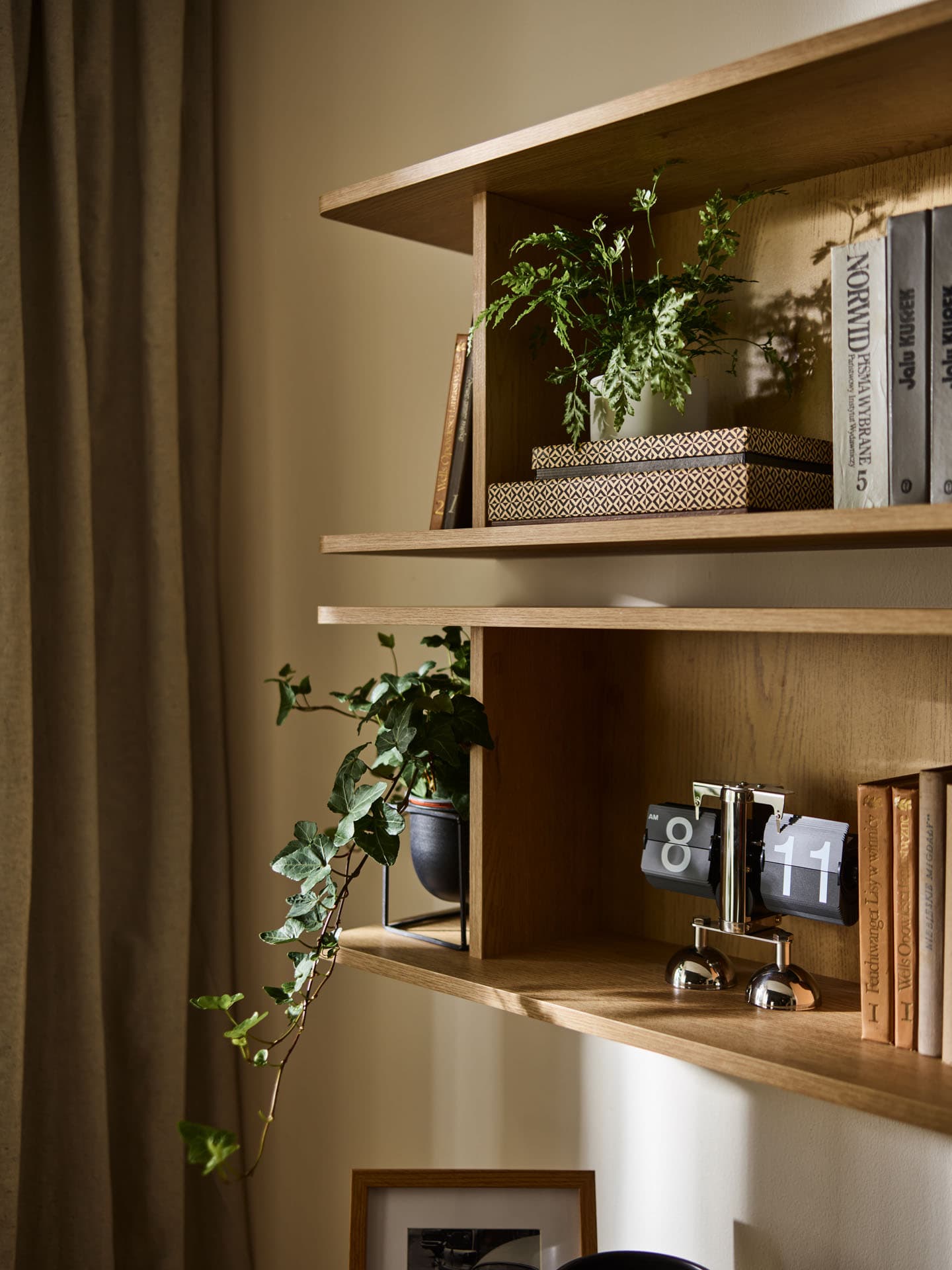 The narrow hanging shelf from the Well collection is a practical piece of furniture that allows you to organize small items and complement the wall arrangement. Simple zoning makes it easy to organize the contents and makes the shelf suitable for the living room, as well as for the bedroom or home office. It is a functional addition to the arrangement, which combines storage space with subtle display.