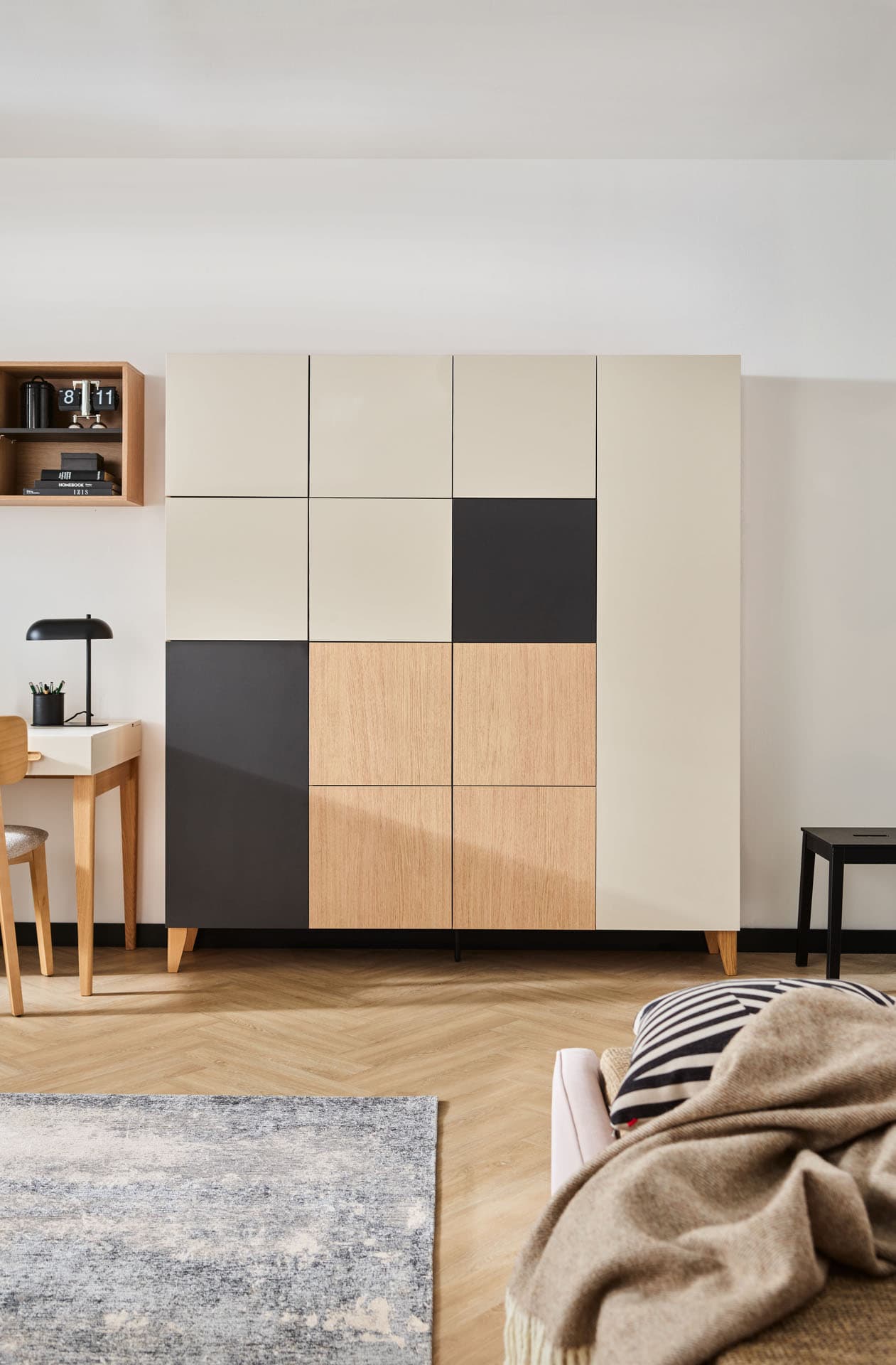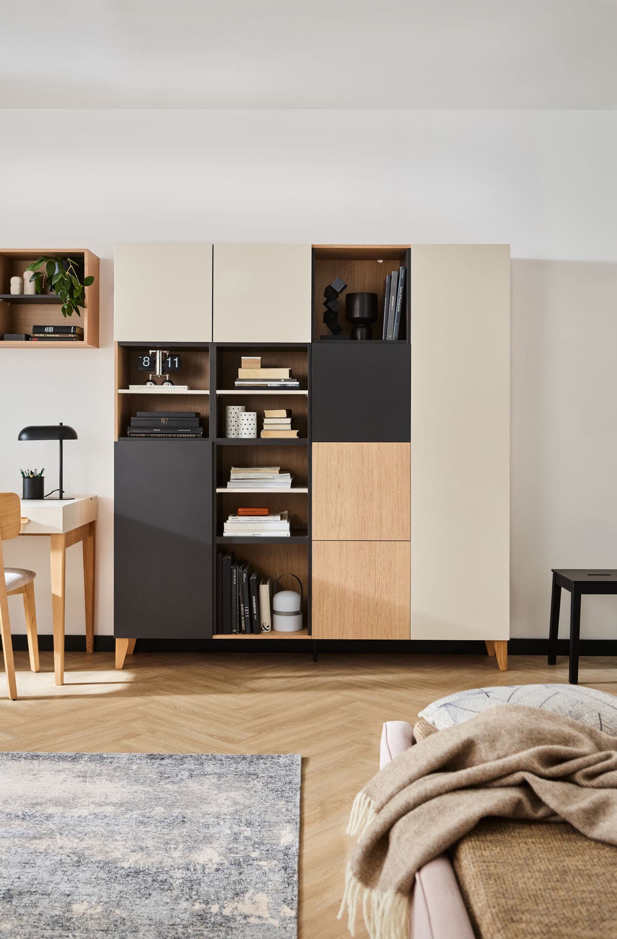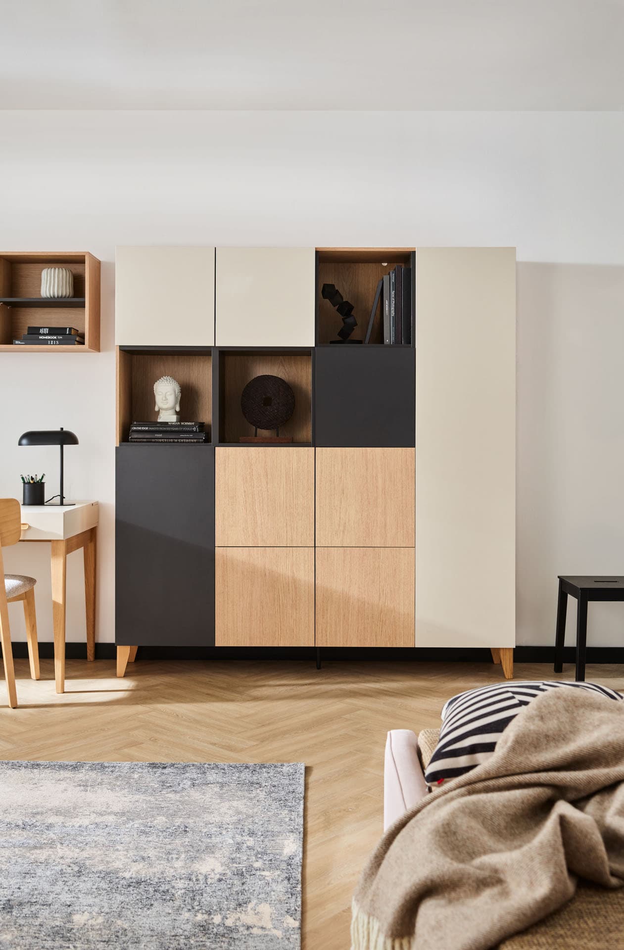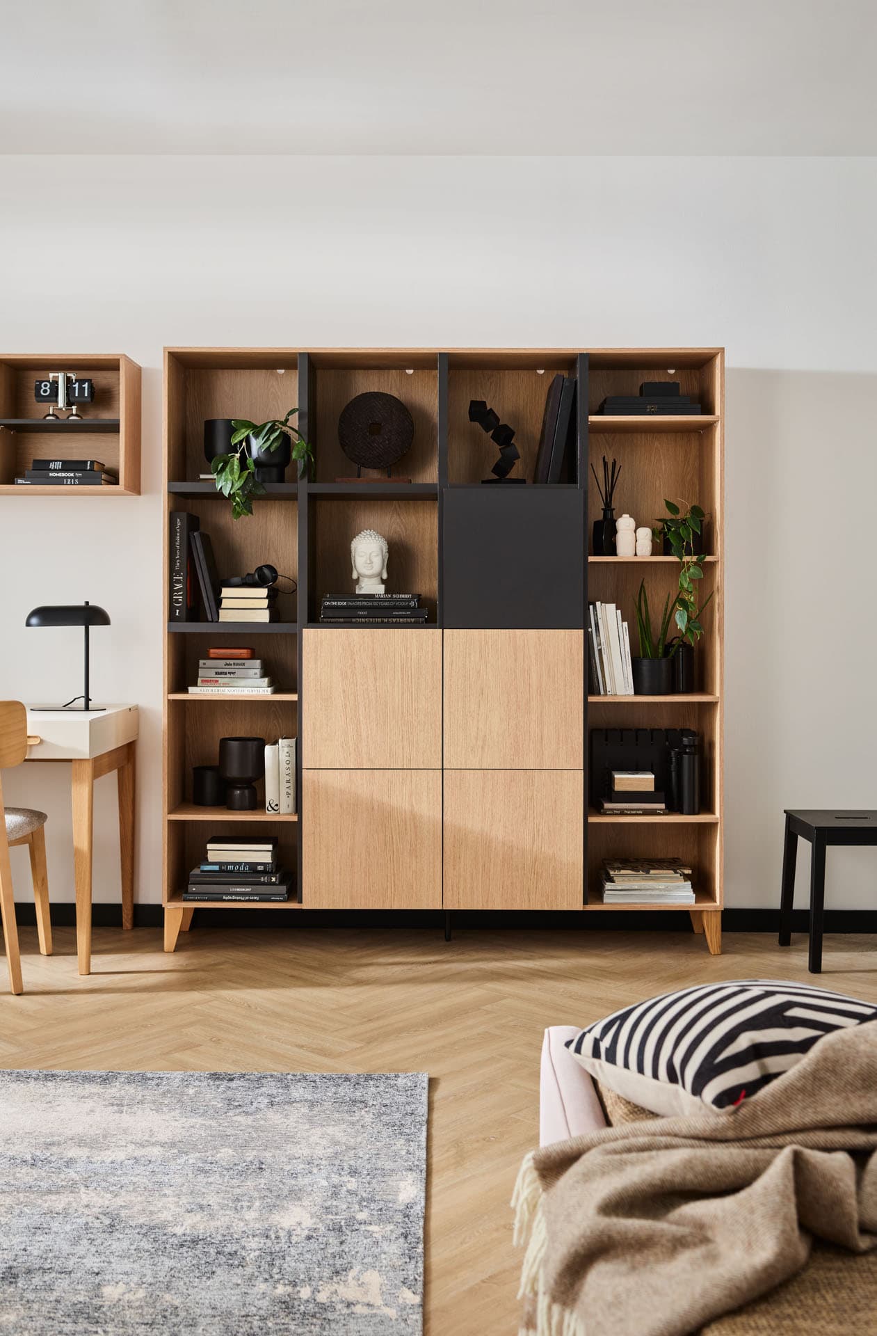 • Check out how the bookcase will present itself in a variety of appearances. Arrange shelves freely, insert doors or bet on open spaces.
