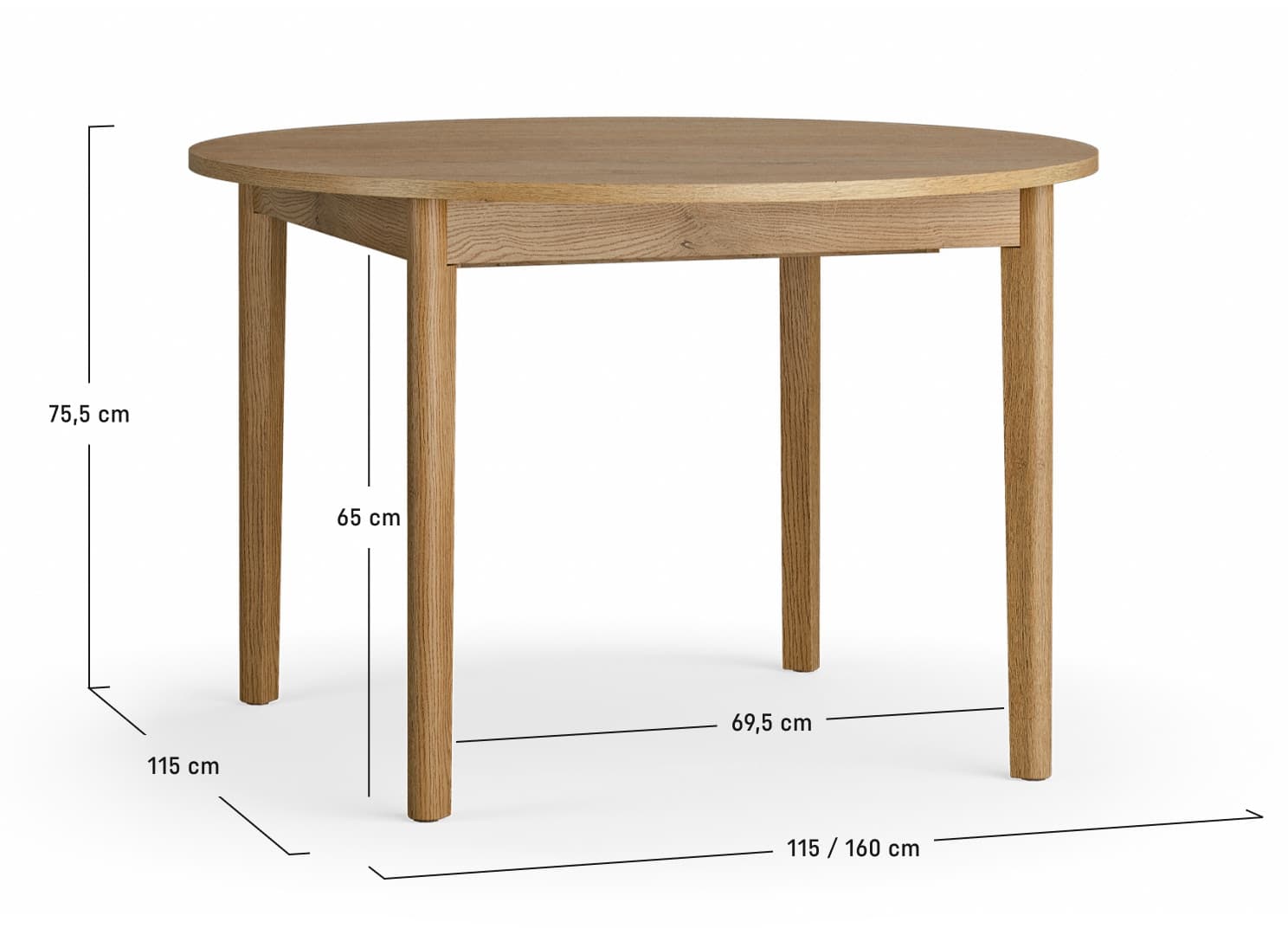- The diameter of the tabletop before extension is 115 cm, and after extension its length increases to 160 cm.