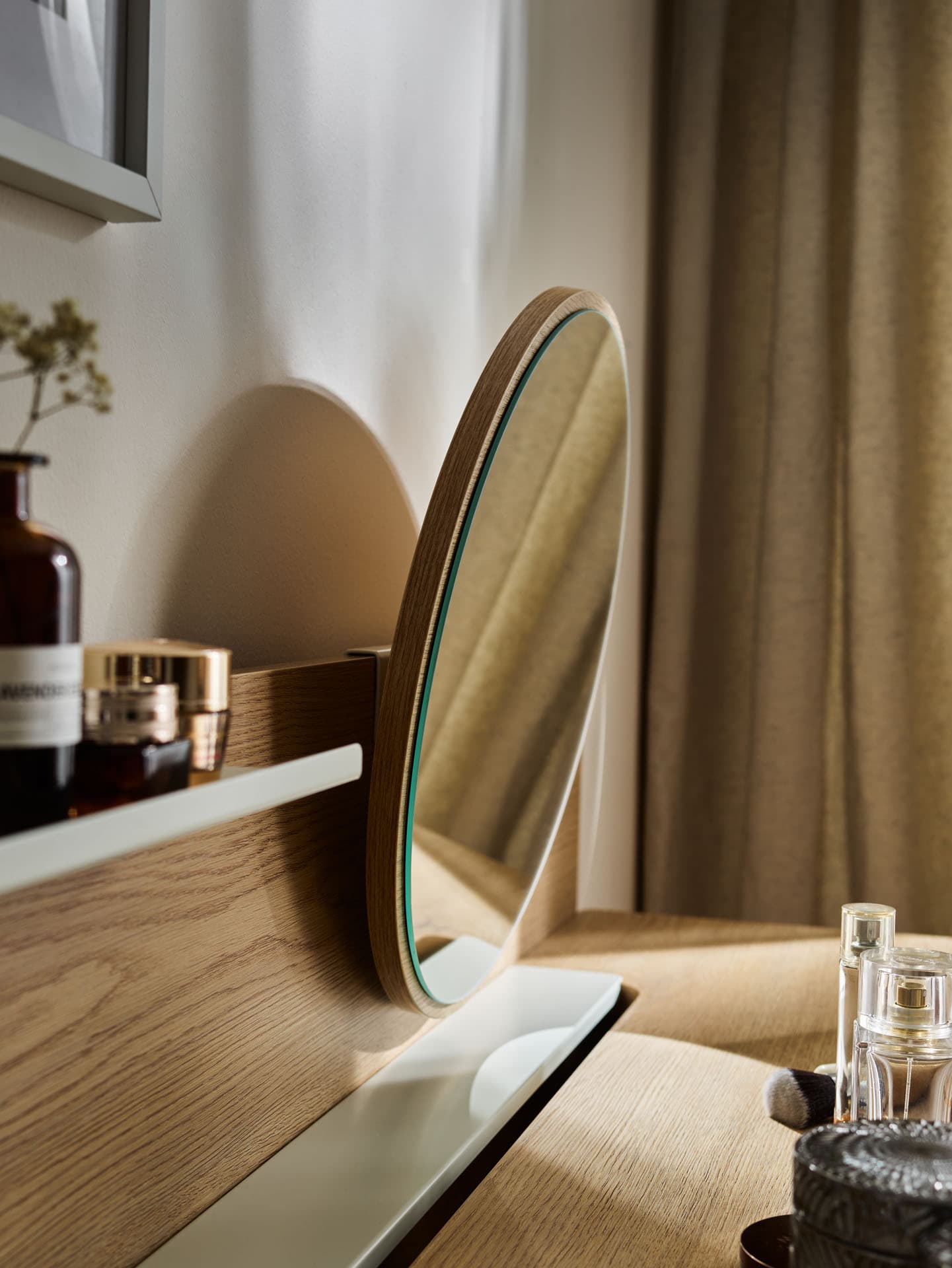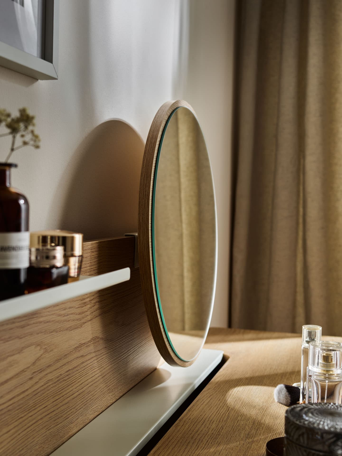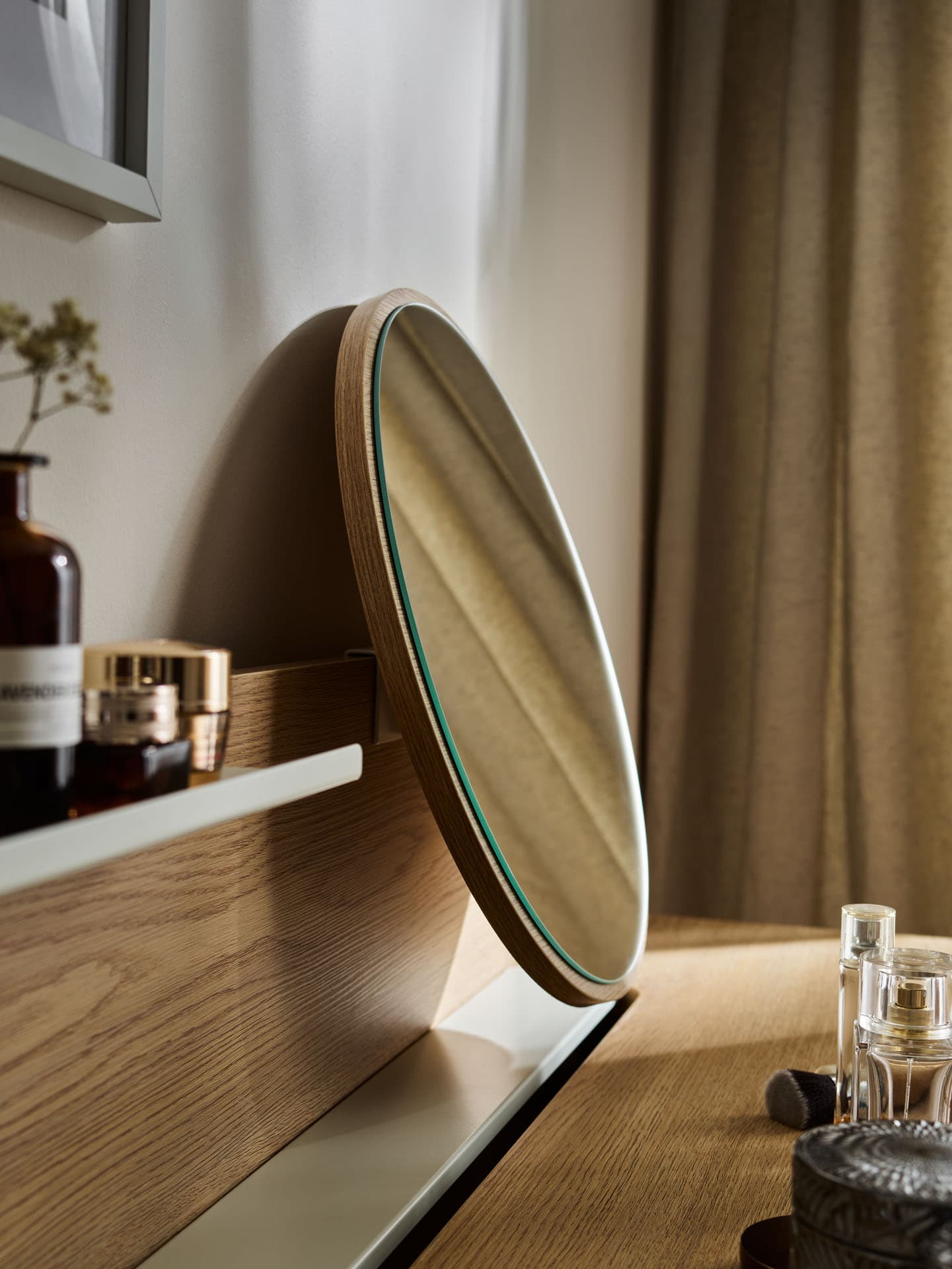 The desk mirror from the Well collection allows you to seamlessly transform your work space into a personal grooming area. The subtle circular form in an oak frame softly complements the line of the desk, and the adjustability makes daily grooming a natural, peaceful ritual.
