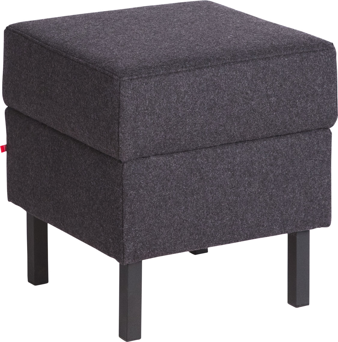 The seat has durable and flexible upholstery foam. The frame is made of plywood, board and sawn timber. The pouffe has black metal legs. The set includes felt pads that will work well on wooden floors.