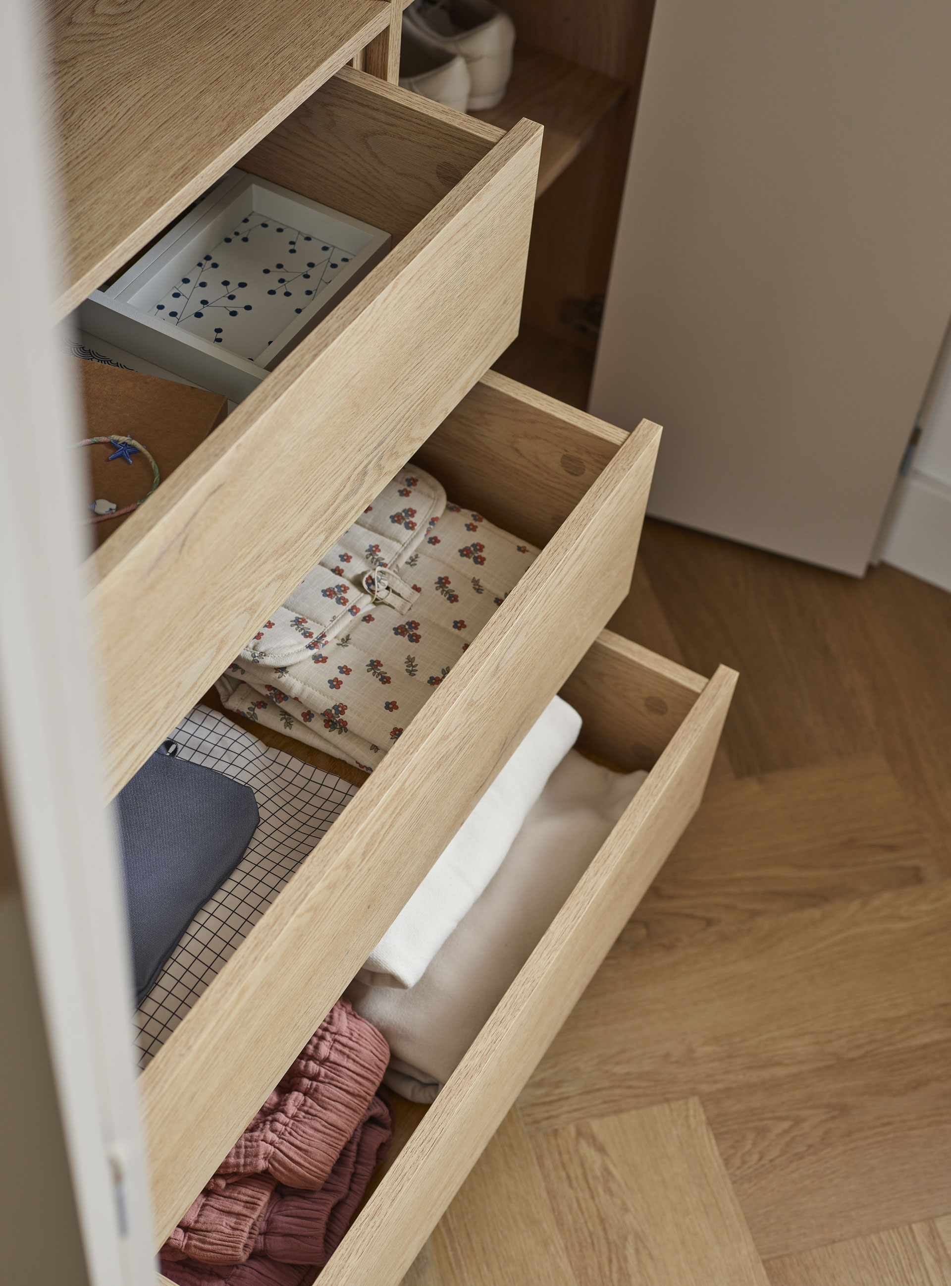 - The body, fronts, dividers and shelves of the wardrobe and drawers (in selected interior packages) are made of high-quality furniture board, which is easy to keep clean. It is resistant to damage and can withstand heavy loads.
