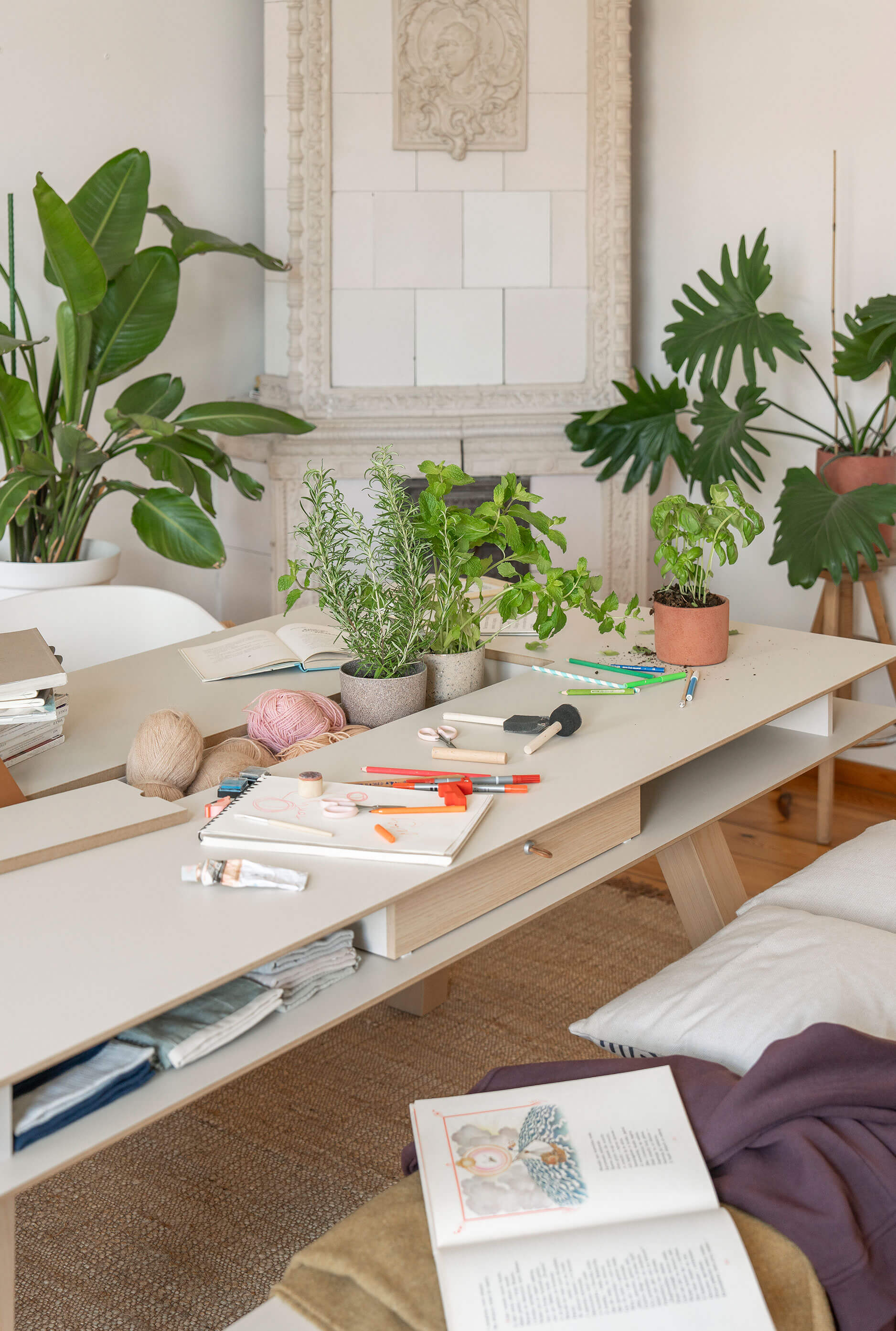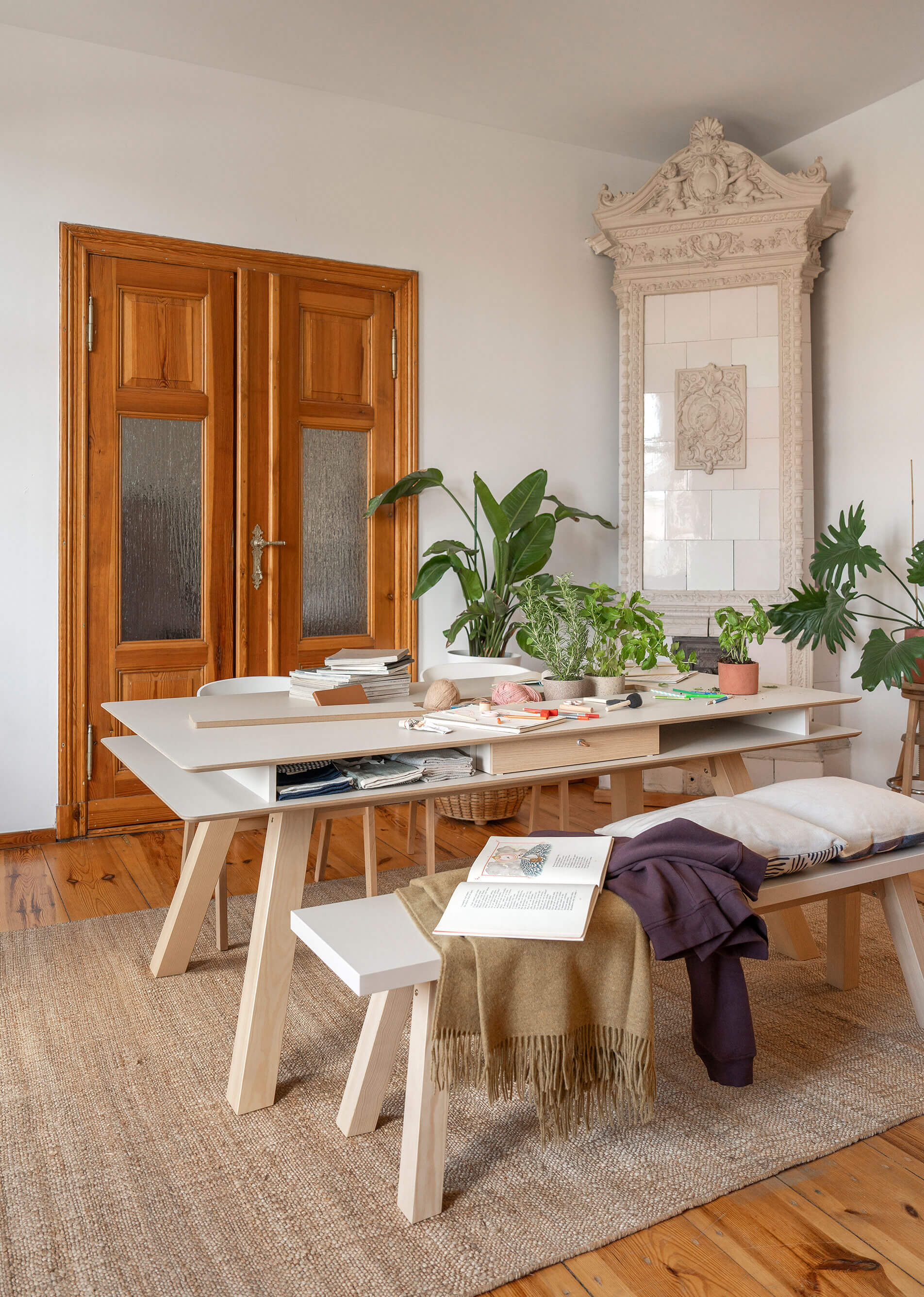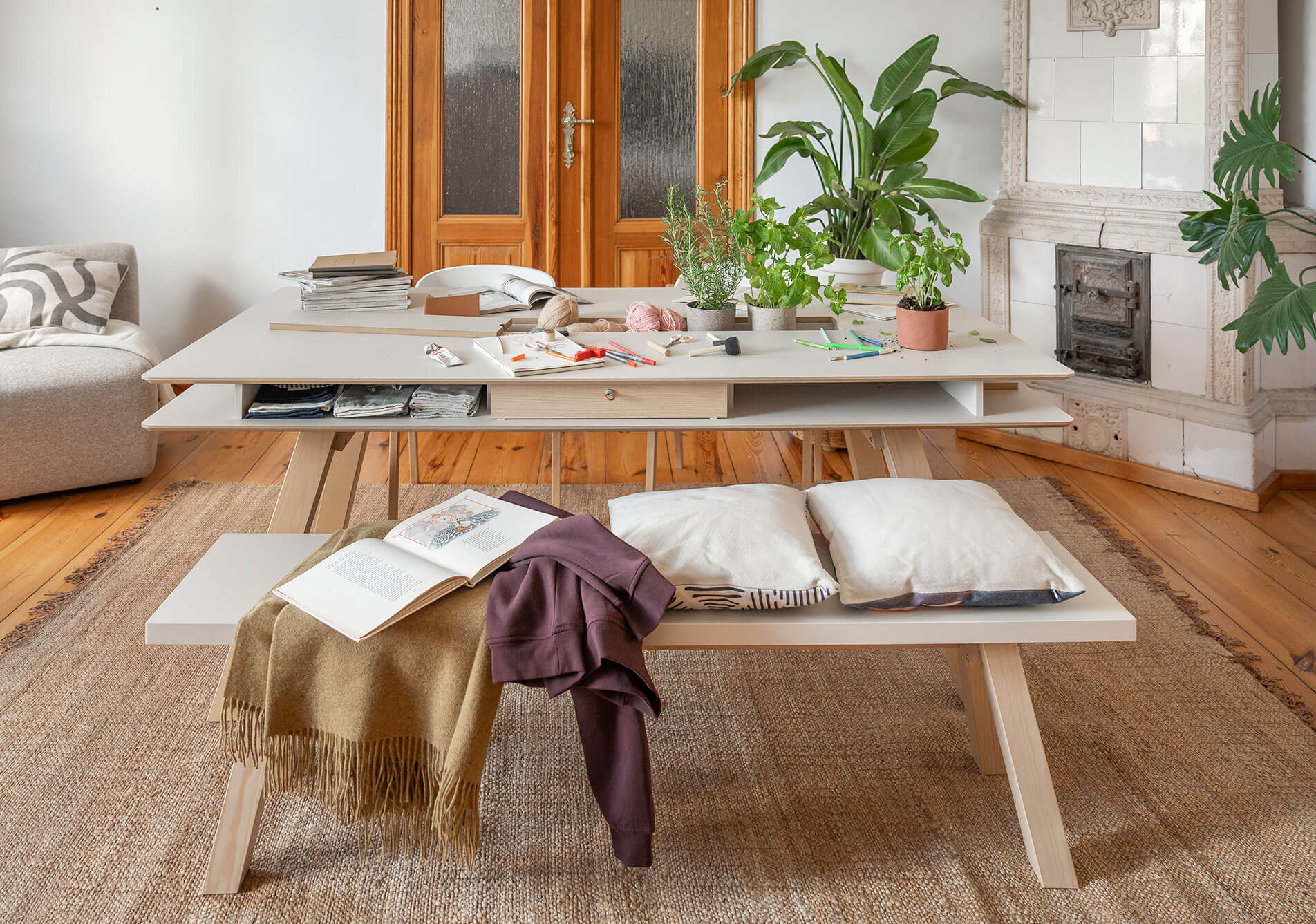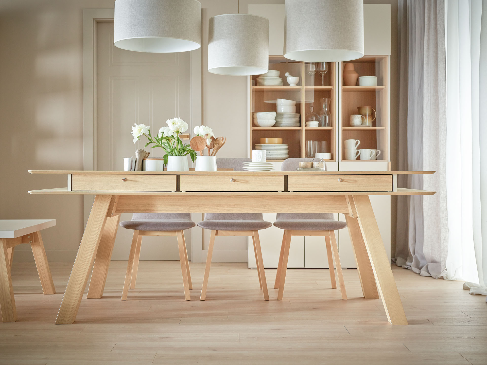 This table will be the star of any kitchen or dining room. In the functional recess in the tabletop you will place flowers, herbs or cutlery, or arrange it in yet another way. Drawers and niches under the tabletop will hide your laptop when you're done working or your children's games and artistic creations.