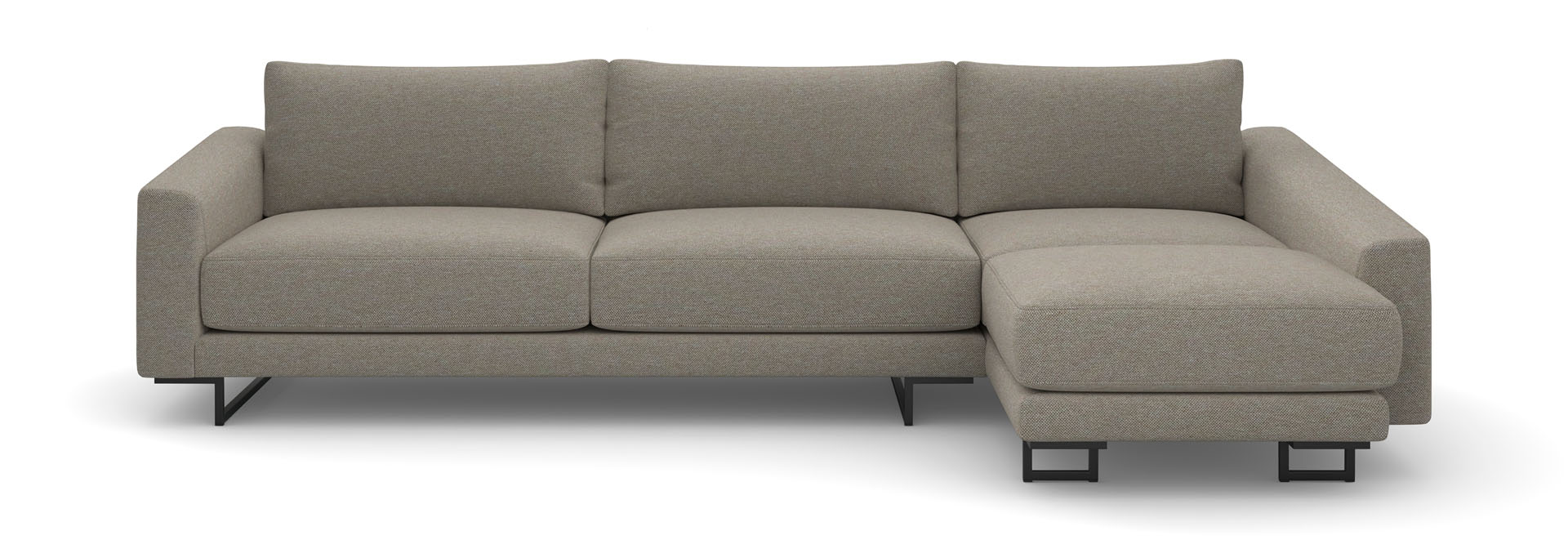 The comfortable Tove corner sofa is large and spacious. Extremely comfortable due to the highest quality filling and very practical to use. With its harmonious, minimalist silhouette and modern metal base, it fits into a variety of design styles. Choose from a version with a chaise longue on the left or right side and a diverse range of upholstery fabrics.