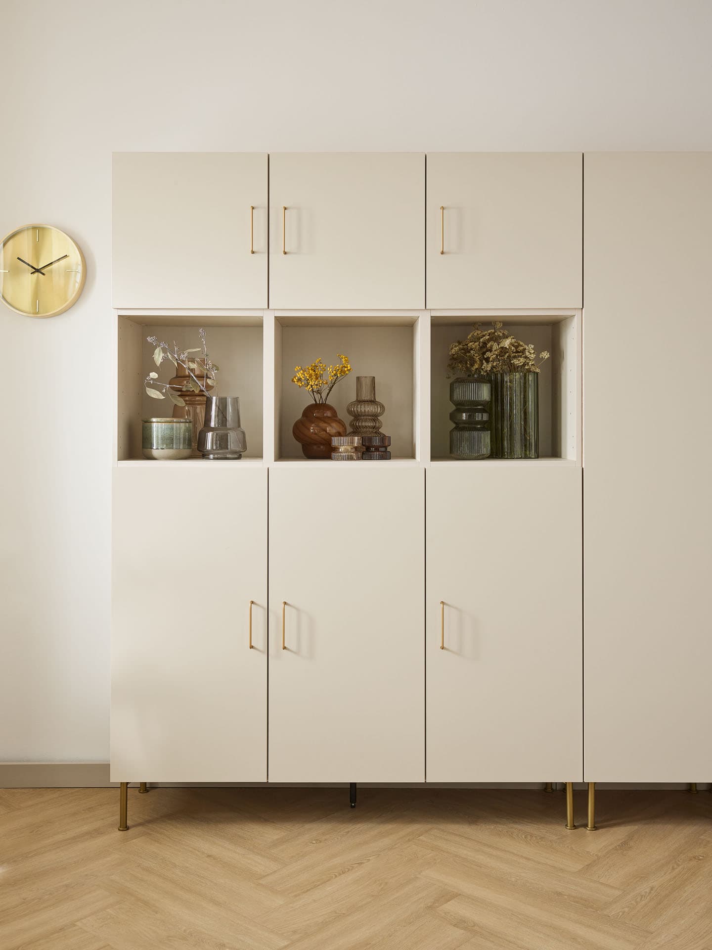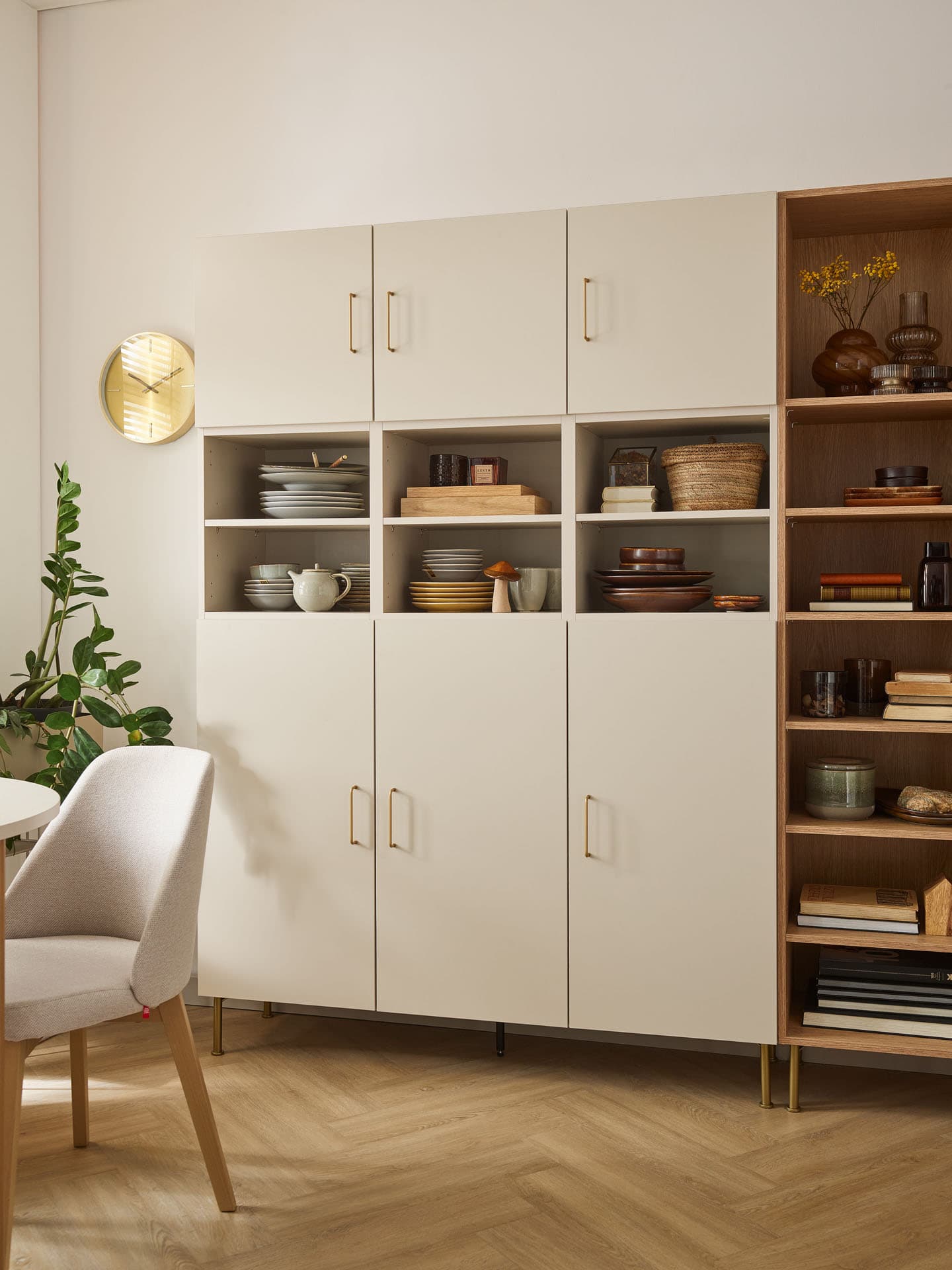 - The shelves in the bookcase can be left open or you can put doors in them - this way you can create capacious cabinets. You can choose from single or double doors in four sizes, and all of them are equipped with a silent closing system.
