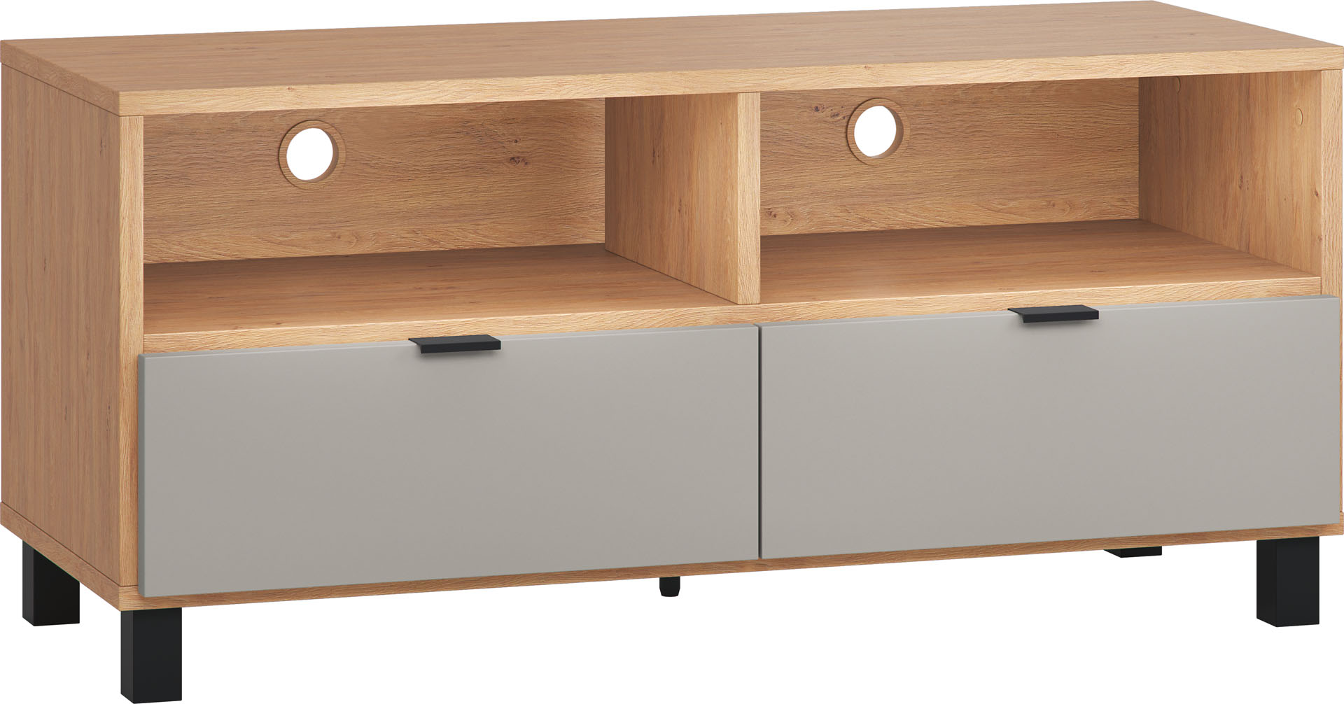 - The depth and height of the cabinet is dictated by the guidelines resulting from the function. The TV set placed on the cabinet will be at an ergonomic height in relation to the viewer sitting on the sofa. The open spaces will accommodate almost any electronic equipment (including the thick cables that come out of it).