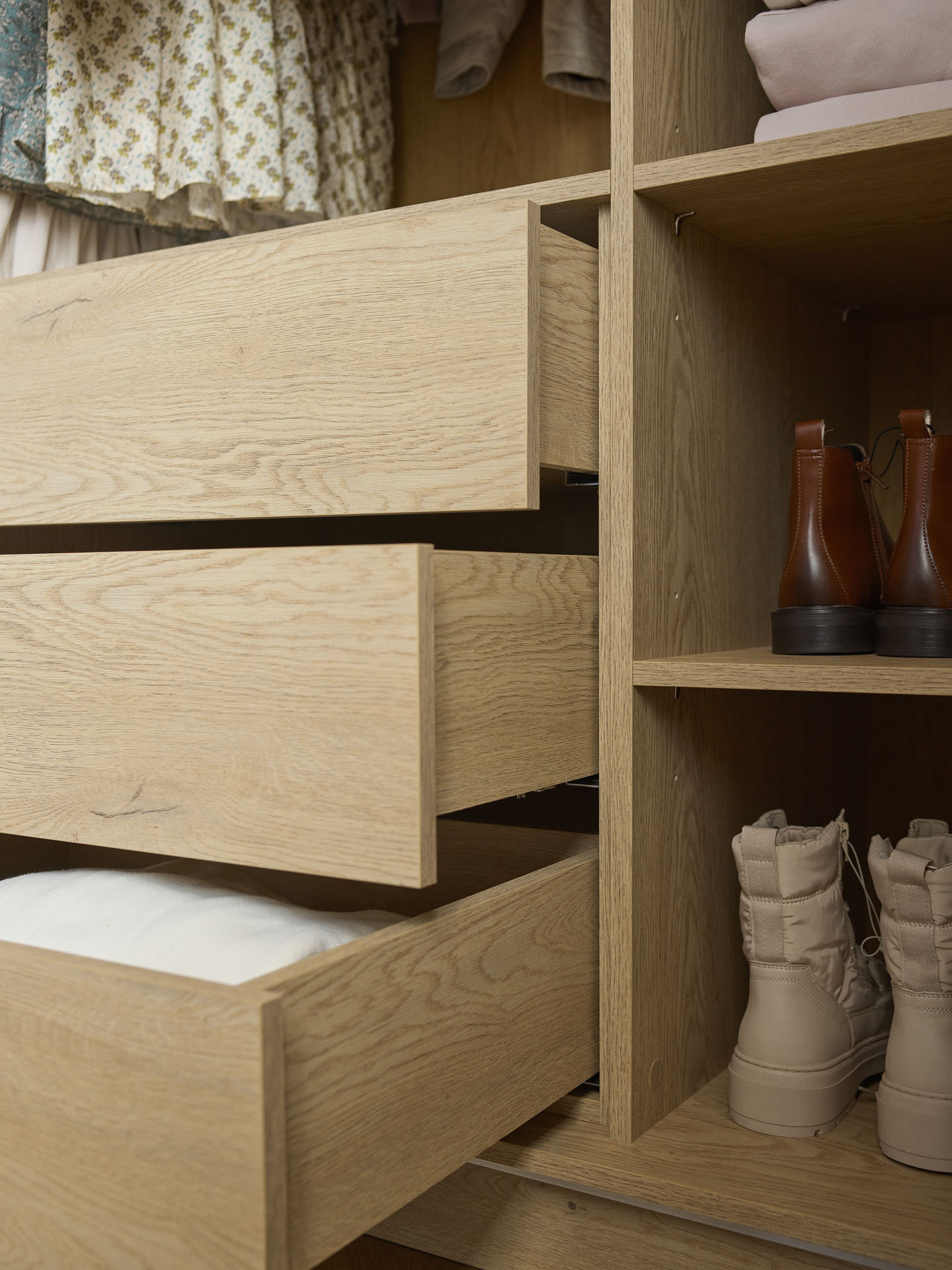 - The body, fronts, dividers and shelves of the wardrobe and drawers (in selected interior packages) were created from high-quality furniture board, which is easy to keep clean. It is resistant to damage and can withstand heavy loads.