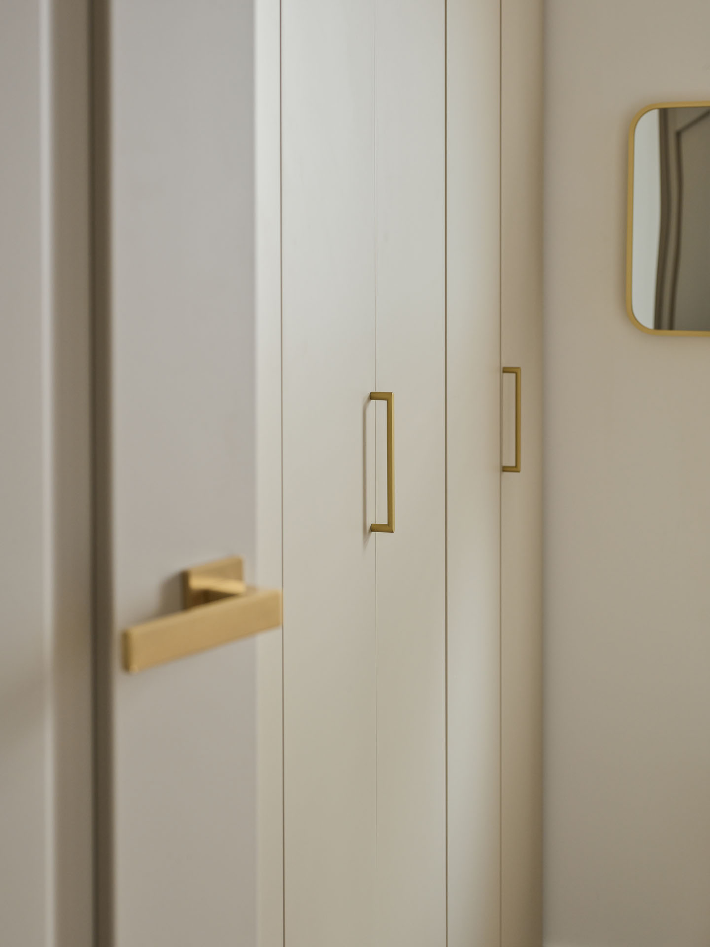 - Sliding-folding doors with a silent closing system fold into an accordion, which provides easy access to the entire contents of the wardrobe and allows the furniture to be placed even near the bed.