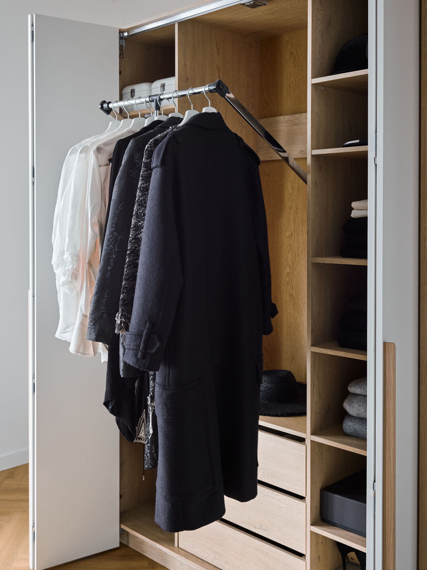 - Thanks to the VOXBOX program, you can easily check how the Stor wardrobe will look in a specific room, for example, in combination with Linerio lamella panels.