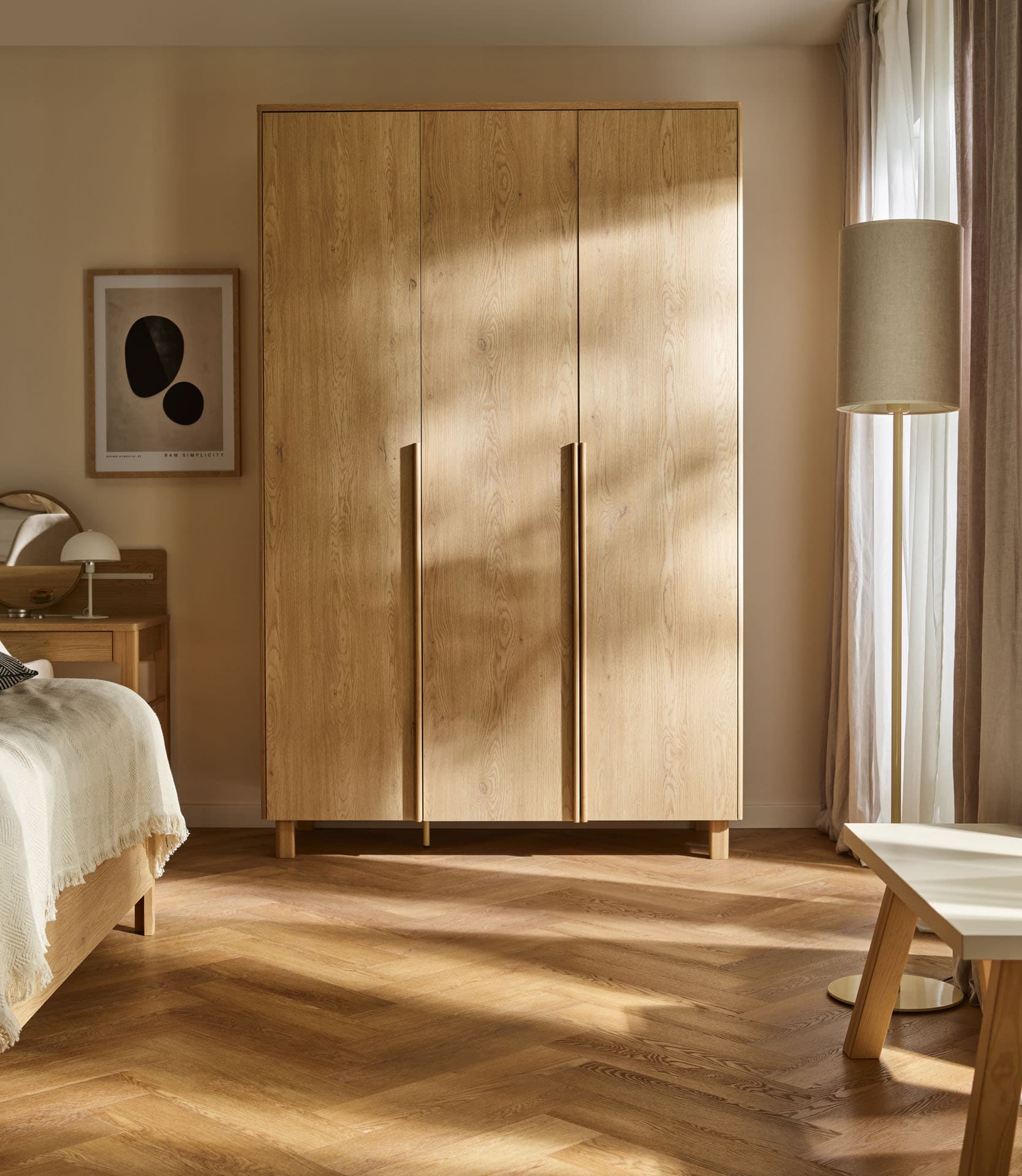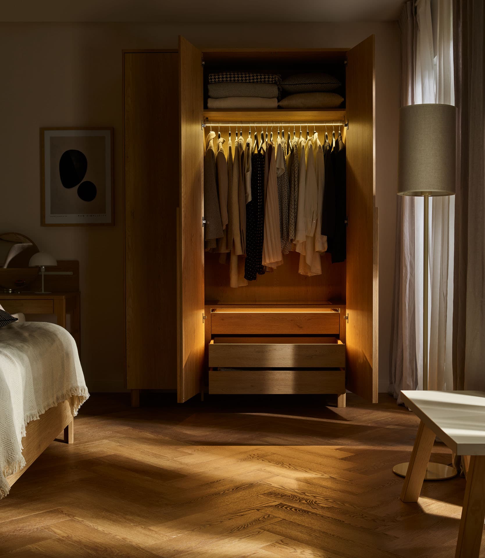 The 3-door wardrobe with lighting from the Well collection is a functional storage piece, designed for clear interior organization and convenient access to the contents. The differentiated layout of the zones makes it easy to store clothes, while the integrated lighting improves visibility and comfort for everyday use. The natural oak grain, soft solid geometry and subtly introduced light make daily use of the wardrobe more intuitive and pleasant. The closet will work well in a bedroom or home closet, creating a harmonious background for daily rituals.