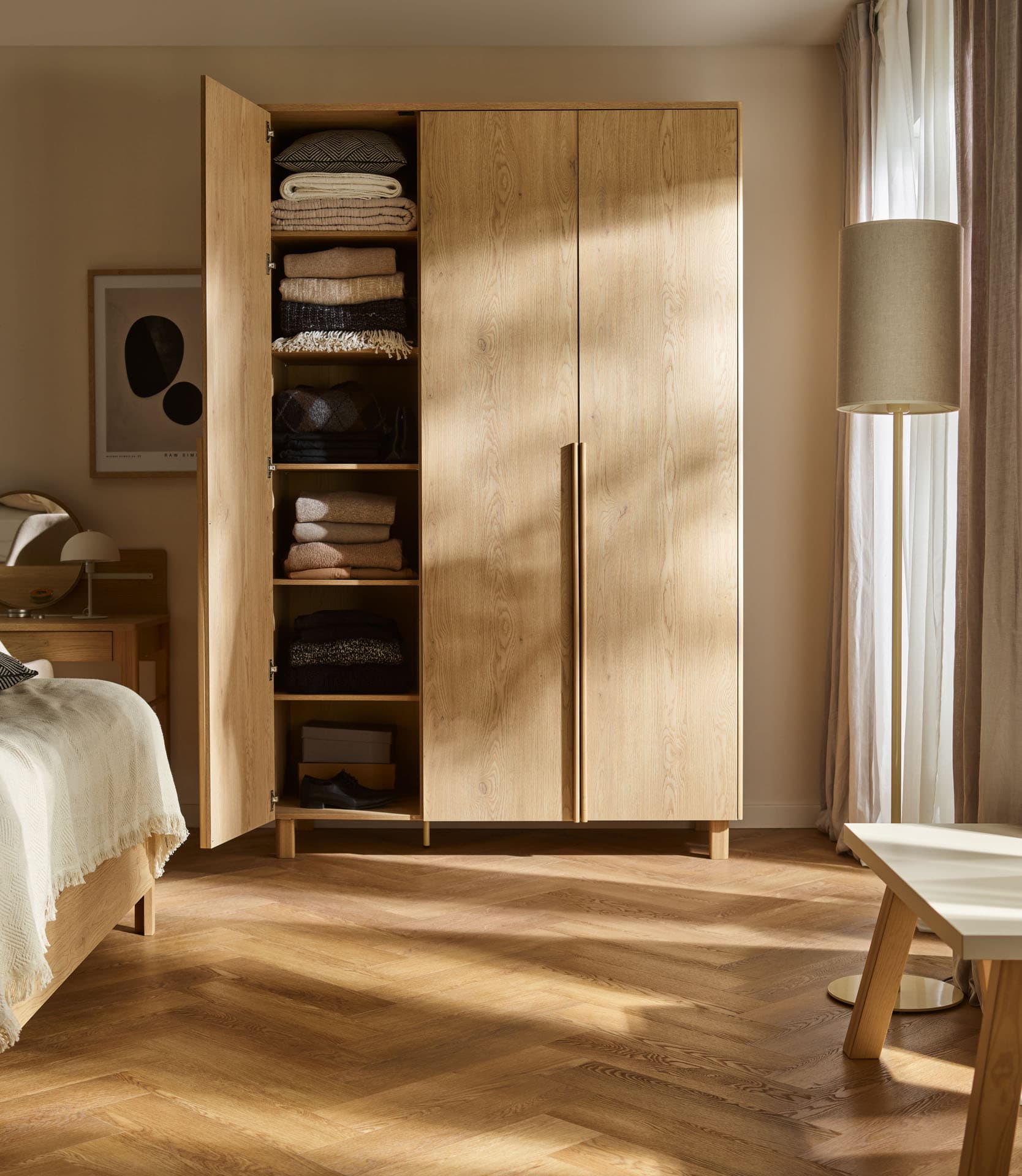 Furniture from the Well collection is in the same color as the oak Stor wardrobes. This is ideal if you want to complement your arrangement with elements from another series, while keeping the identical shade and texture of the material.