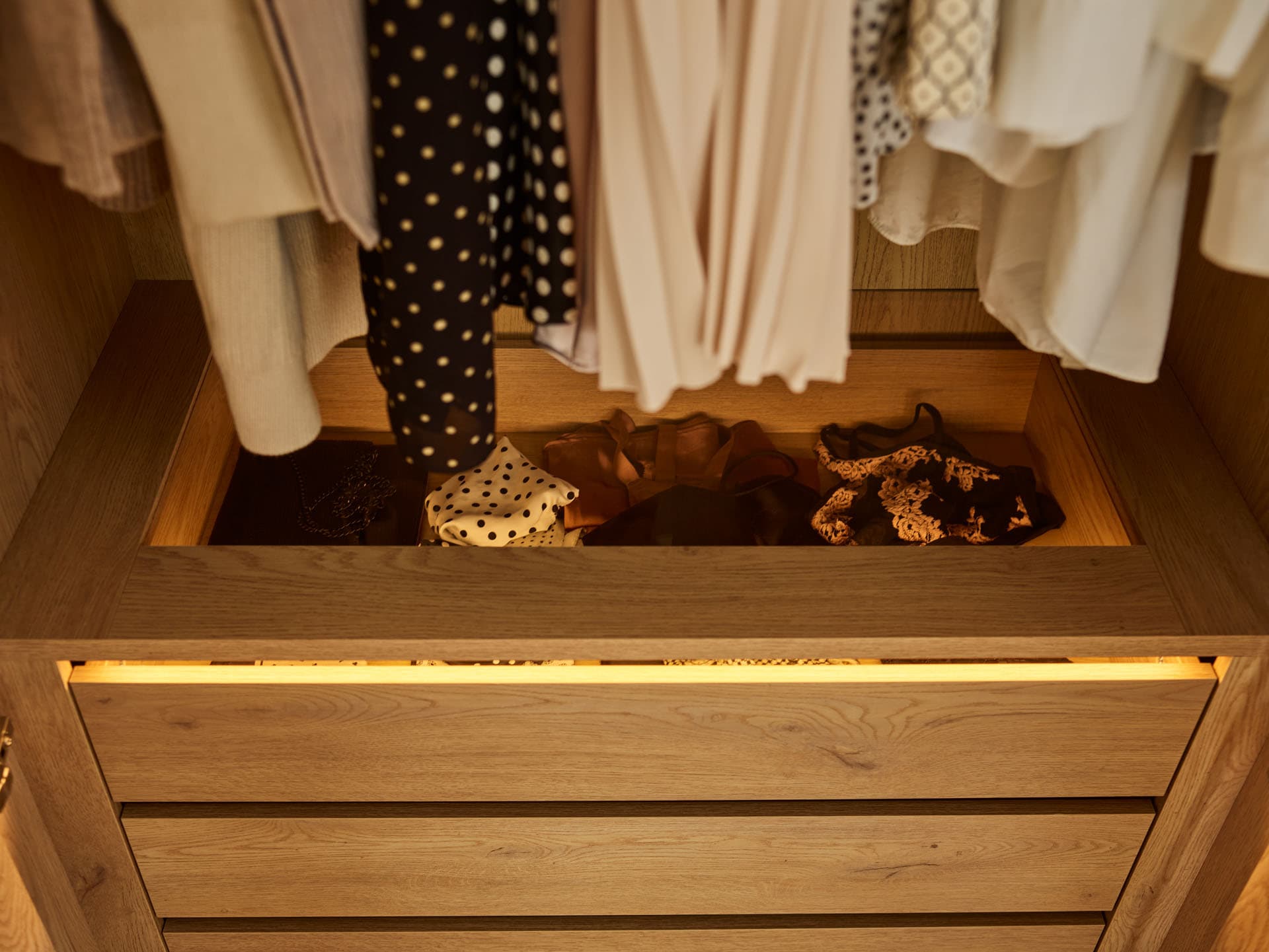 - Above the drawers there is a horizontal glass partition with LED lighting, which subtly brightens the interior and improves the visibility of the contents.