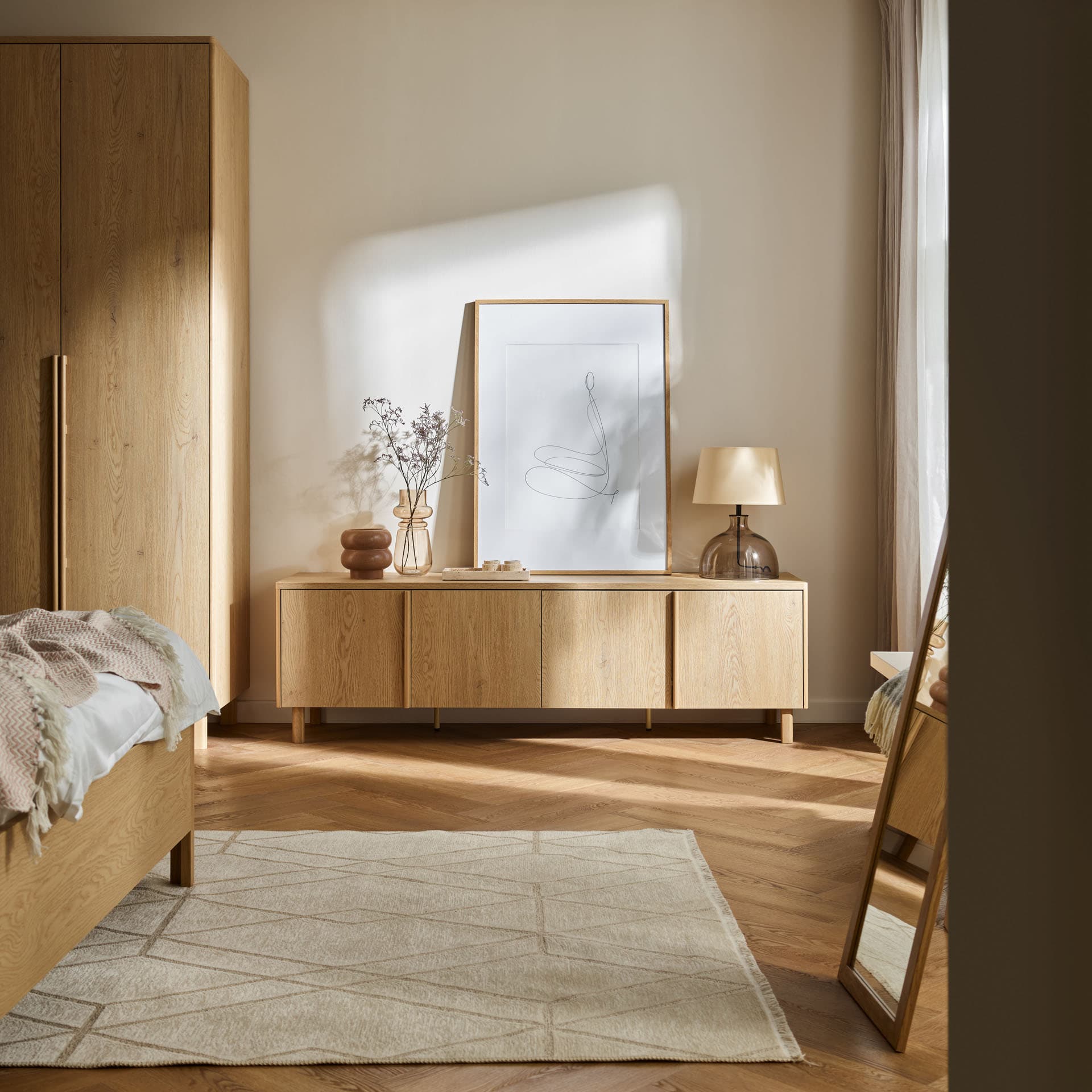 Furniture from the Well collection is in the same color as the oak Stor wardrobes. This is ideal if you want to complement your arrangement with elements from another series, while keeping the identical shade and texture of the material.