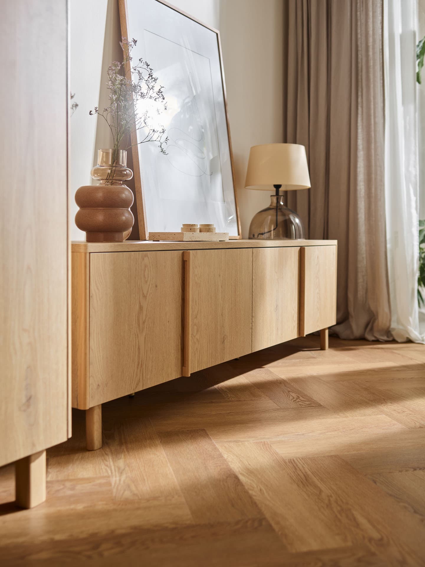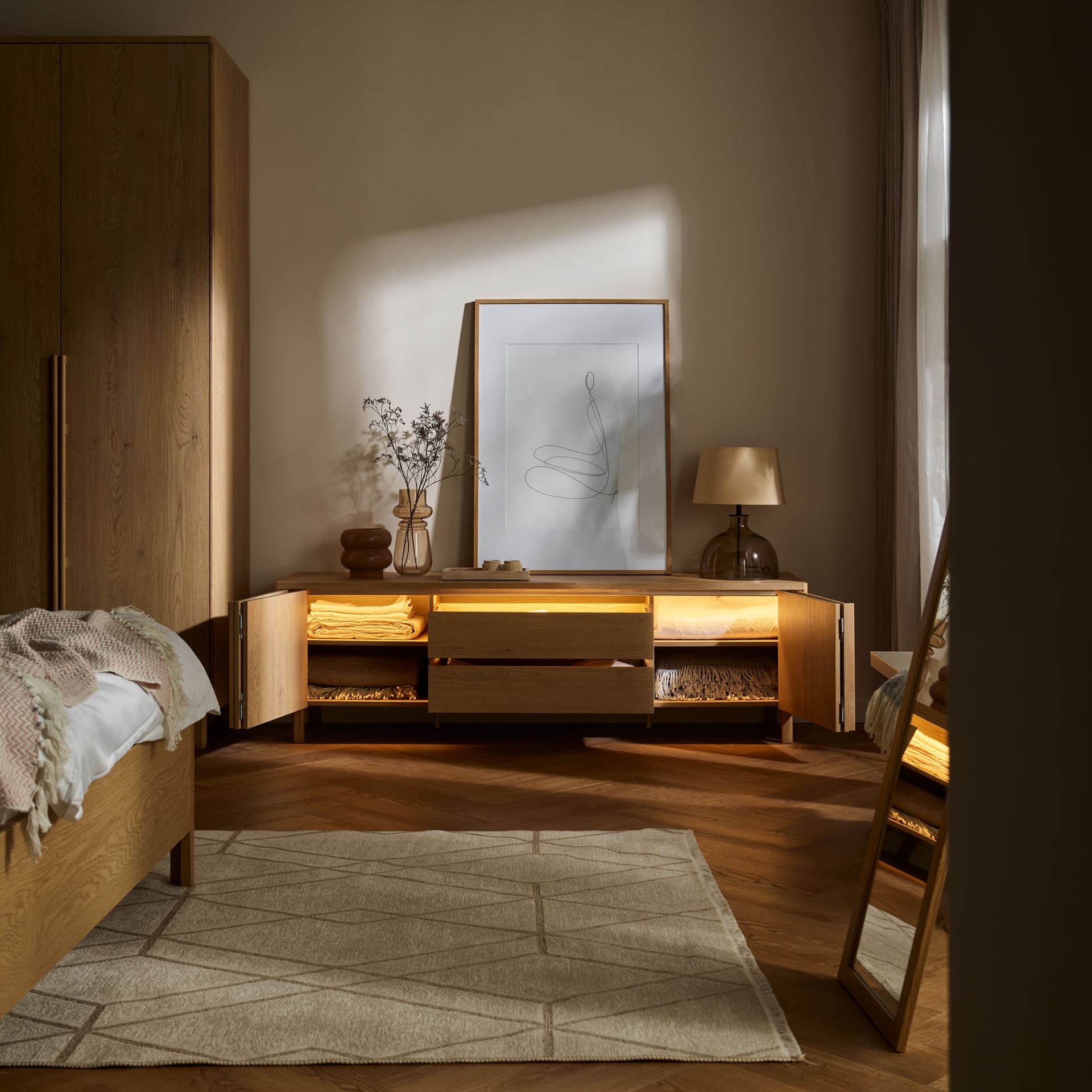 Wide chest of drawers with lighting Well is a stable, horizontal solid that organizes the space and brings a calm rhythm to the interior. Its expansive form and soft lines make the furniture visually "calms" the arrangement and naturally builds a sense of order in the living area. Designed for everyday use, it offers comfortable storage space without compromising on function and aesthetics.