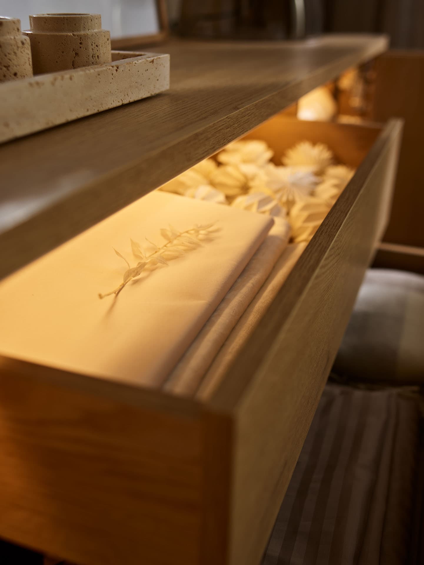 - In the center section of the dresser there are two internal drawers with a silent closing system, which facilitate organization and ensure smooth, comfortable daily use.