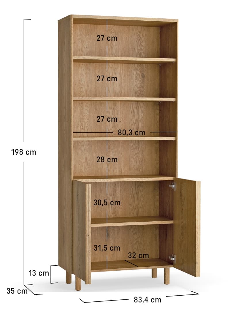 - The bookcase is part of the Well collection and can be combined with products from this series, for example with a 2-door chest of drawers or a coffee table.